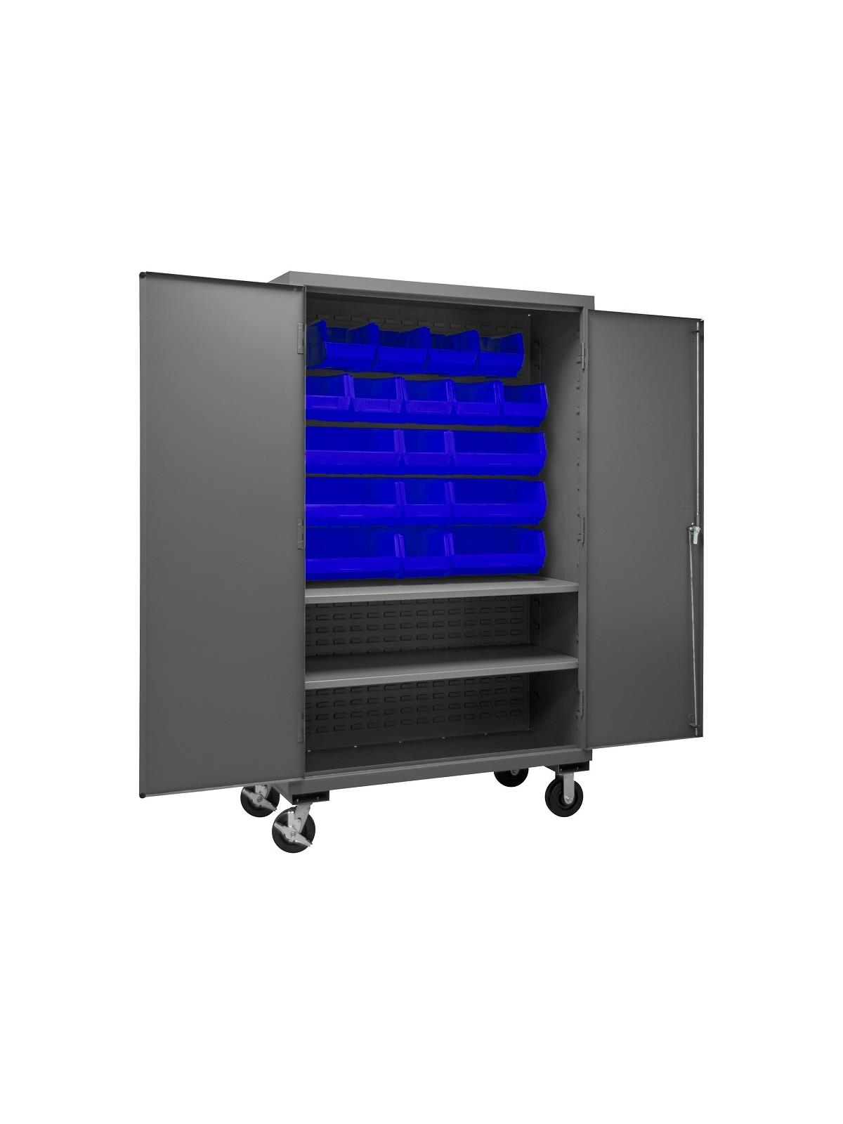 Heavy duty, all welded 14-gauge steel with 6" x 2" phenolic casters (2 rigid, 2 locking swivel). 3-point locking system with keyed handle and lock rods, 4 keys included. Side handle for easy maneuvering. Fully welded louvered panels reinforce back and hold Hook-On-Bins® and adjustable shelves rest on louvered panels and adjust on 4"centers. No tools required for installation. Hook-On-Bins® by Durham are included and install with no tools required. Gray textured powder coat finish. Available in three bin colors, Red (-1795), Blue (-5295), or Yellow (-95). FOB Shipping Point.