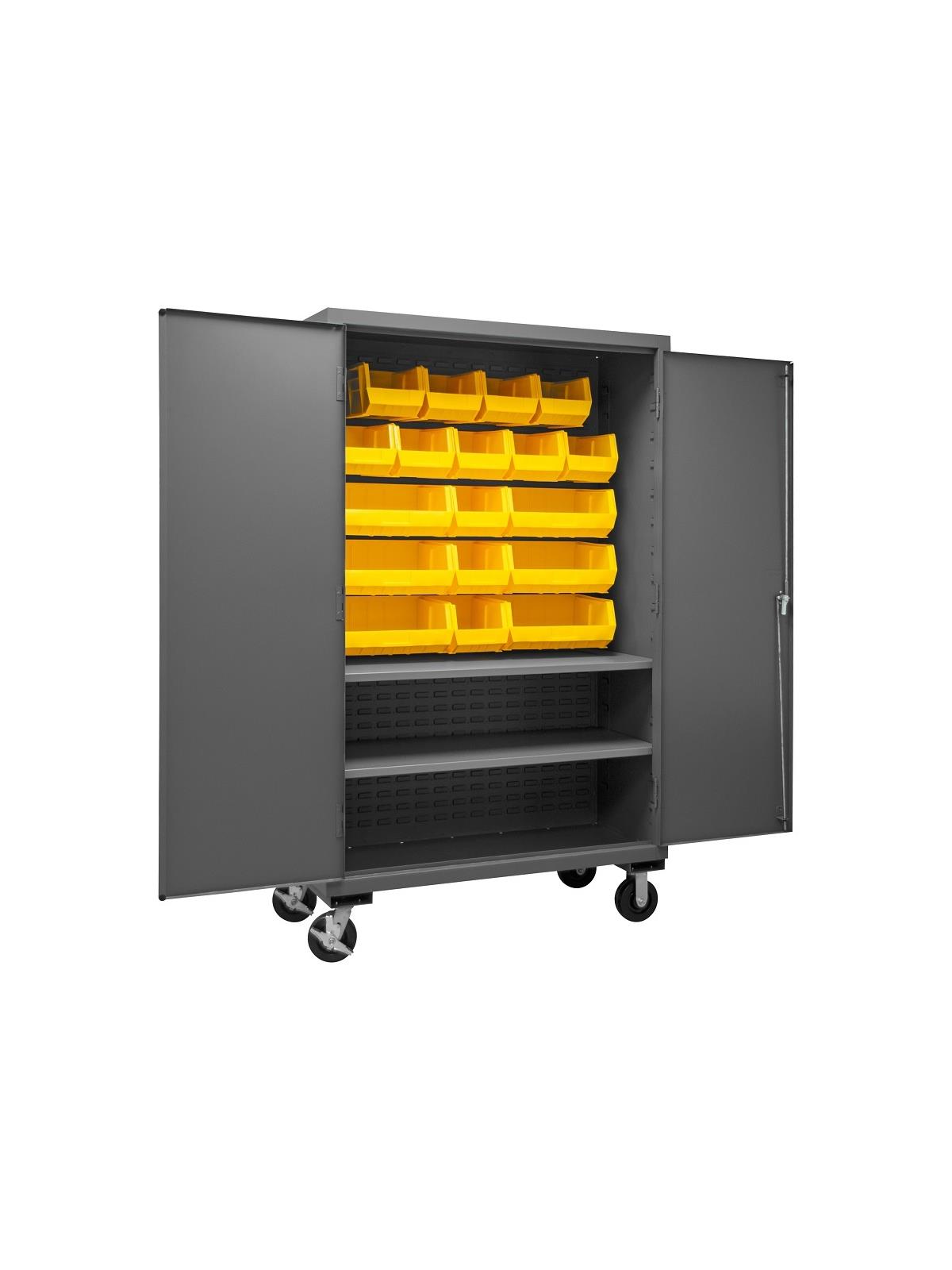Heavy duty, all welded 14-gauge steel with 6" x 2" phenolic casters (2 rigid, 2 locking swivel). 3-point locking system with keyed handle and lock rods, 4 keys included. Side handle for easy maneuvering. Fully welded louvered panels reinforce back and hold Hook-On-Bins® and adjustable shelves rest on louvered panels and adjust on 4"centers. No tools required for installation. Hook-On-Bins® by Durham are included and install with no tools required. Gray textured powder coat finish. Available in three bin colors, Red (-1795), Blue (-5295), or Yellow (-95). FOB Shipping Point.