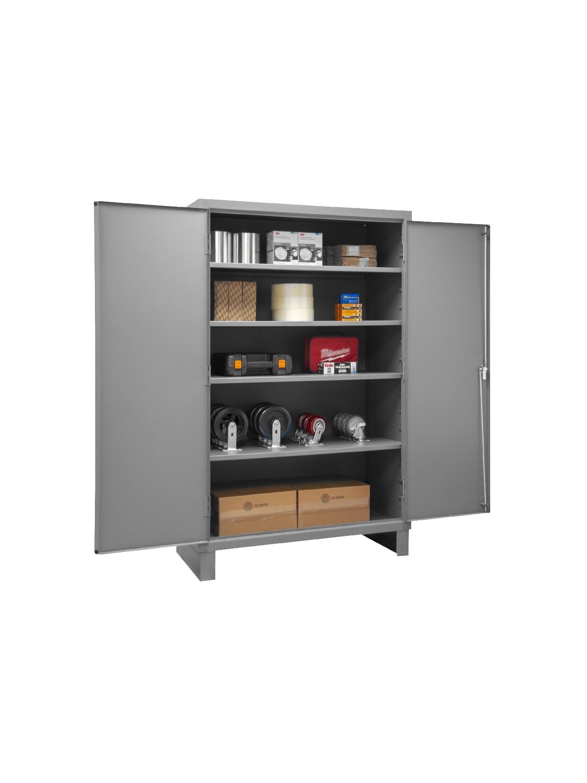 Industrial duty, all welded 16-gauge steel with 3-point locking system with keyed handle and lock rods, 4 keys included. Adjustable shelves rest on louvered panels and adjust on 4" centers. No tools required for installation. H2505 & H2506 models have 6"H base/legs which provide access for forklifts, pre-punched holes allow for lagging to the floor. (Constructed of 3/16" steel) Gray, textured powder coat finish. FOB Shipping Point.
