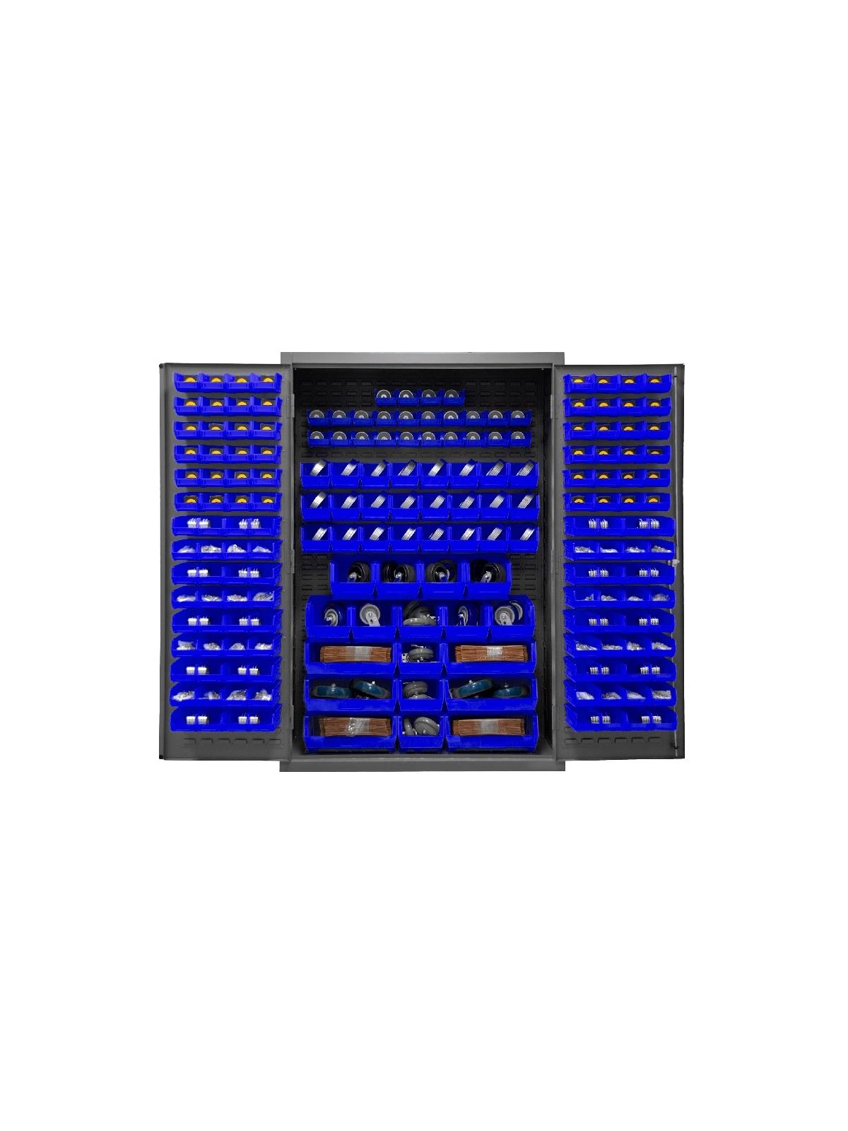 3-point locking system with keyed handle and lock rods, 4 keys included. Full height, formed and recessed doors with heavy duty, leaf hinges to prevent sagging and warping. Fully welded louvered panels reinforce door and accommodates Hook-On-Bins®. Hook-On-Bins® installed easily with no tools required. Hook-On-Bins® are included. Durable, gray textured powder coat finish. Available in three bin colors, Red (-1795), Blue (-5295), or Yellow (-95). FOB Shipping Point.