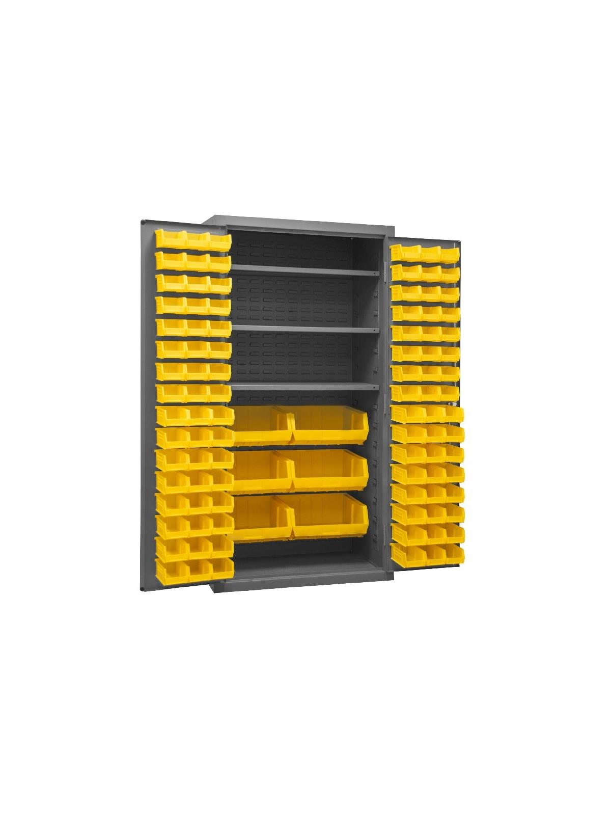 3-point locking system with keyed handle and lock rods, 4 keys included. Full height, formed and recessed doors with heavy duty, leaf hinges to prevent sagging and warping. Adjustable shelves rest on louvered panels and adjust on 4" centers. No tools required for installation. Fully welded louvered panels reinforce door and accommodate Hook-On Bins®. Hook-On Bins® installed easily with no tools required. Hook-On Bins® are included. Durable, gray, textured powder coat finish. Available in three bin colors, Red (-1795), Blue (-5295), or Yellow (-95). FOB Shipping Point.
