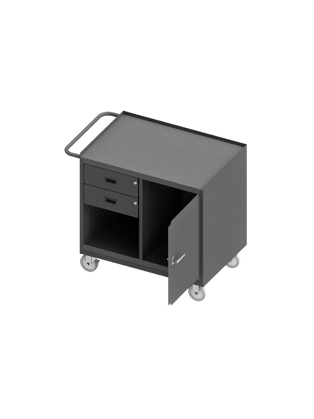 Bench cabinets are constructed of 14 gauge steel. Convenient sturdy work surface with back and end stops on the work surface prevents parts from falling off during transport (MT units not included). Tubular handle for easy maneuverability. Cabinet doors have a 3 point locking system with 4 keys. Rolls smoothly on 5" polyurethane bolt-on casters, (2) swivel with side brakes and (2) rigid. 36"W model has 1,200 lbs. capacity. 48"W model has 2,000 lbs. capacity and includes a floor lock to keep the unit in place while you work. FOB Shipping Point.