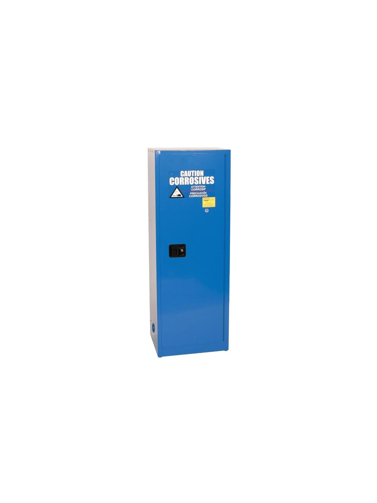 Eagle acid corrosive safety cabinets are constructed of 18-gauge (1mm) steel. They are designed to store small containers of acids and corrosive liquids. All interior and exterior cabinet walls are finished with blue epoxy powder coating for superior protection against chemical corrosion. Each cabinet has high-density polyethylene (HDPE) trays for the shelves, adjustable poly shelves, storage for smaller containers in the doors, lockable doors, internal and top sump capacities, and poly vents with caps. Most of the corrosive safety cabinets are FM approved. FOB Shipping Point.