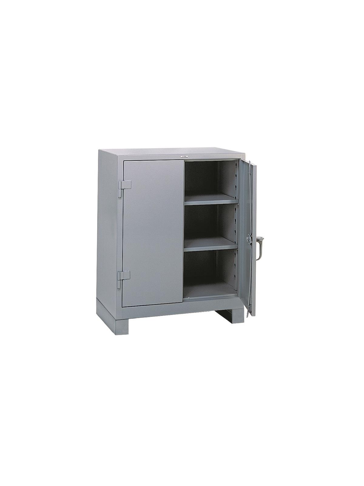 All-welded 14-gauge steel construction provides a payload capacity of 1,450 lbs. per shelf. Rugged cast iron handle features a 3/8" thick padlock hasp (lock not included) and 3 heavy-duty 5/16" brass pin hinge plates welded to each door. Secure, 3-point locking system on doors features 3/8" latch rod and 3/16" latch plate. Shelves bolt securely into welded keyhole slots and can be repositioned on 3" centers. Additional shelves are available - call for details. 4" high legs welded to cabinet create a forklift base. FOB Shipping Point.