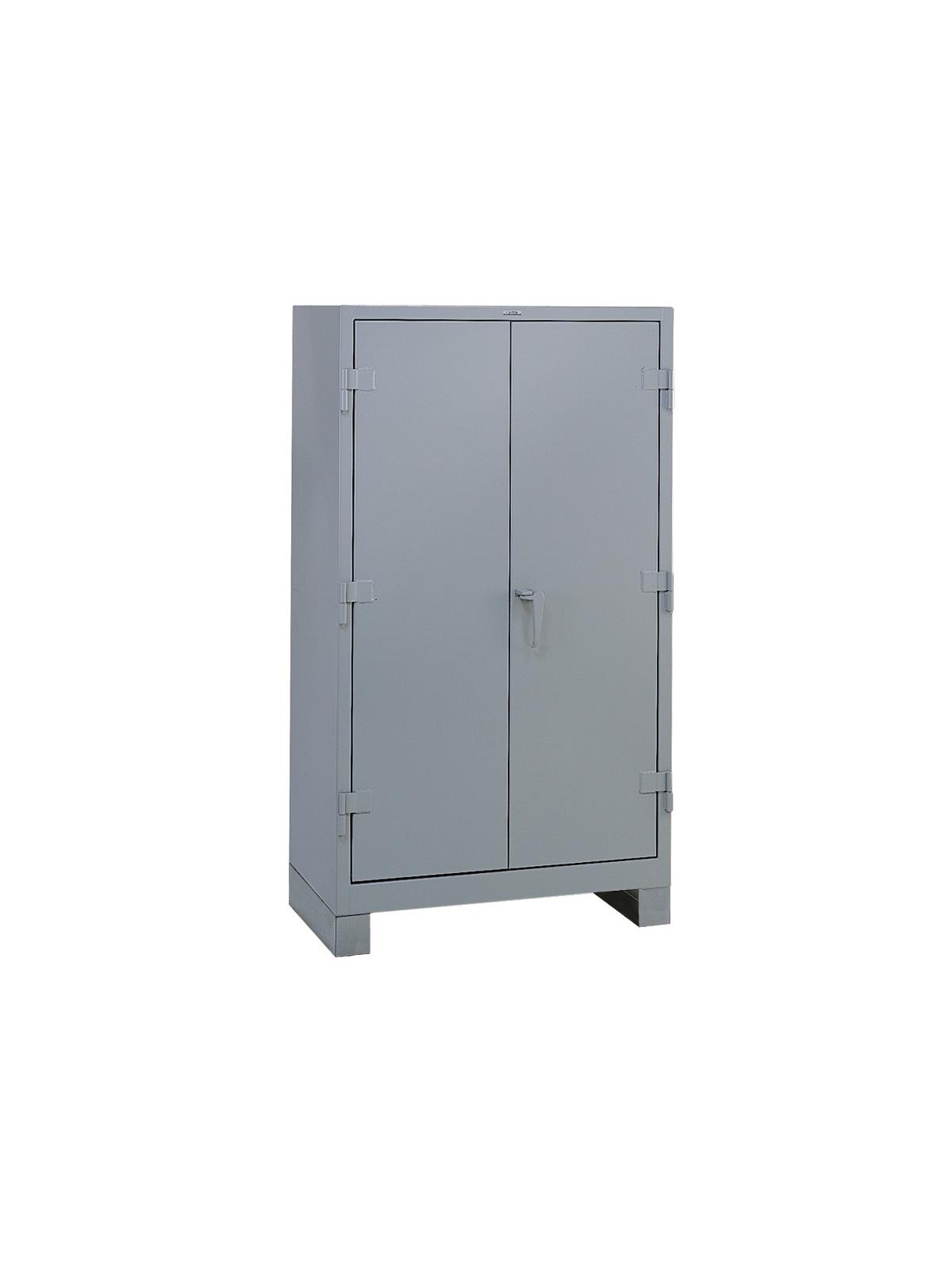 All-welded 14-gauge steel construction provides a payload capacity of 1,450 lbs. per shelf. Rugged cast iron handle features a 3/8" thick padlock hasp (lock not included) and 3 heavy-duty 5/16" brass pin hinge plates welded to each door. Secure, 3-point locking system on doors features 3/8" latch rod and 3/16" latch plate. Shelves bolt securely into welded keyhole slots and can be repositioned on 3" centers. Additional shelves are available - call for details. 4" high legs welded to cabinet create a forklift base. FOB Shipping Point.