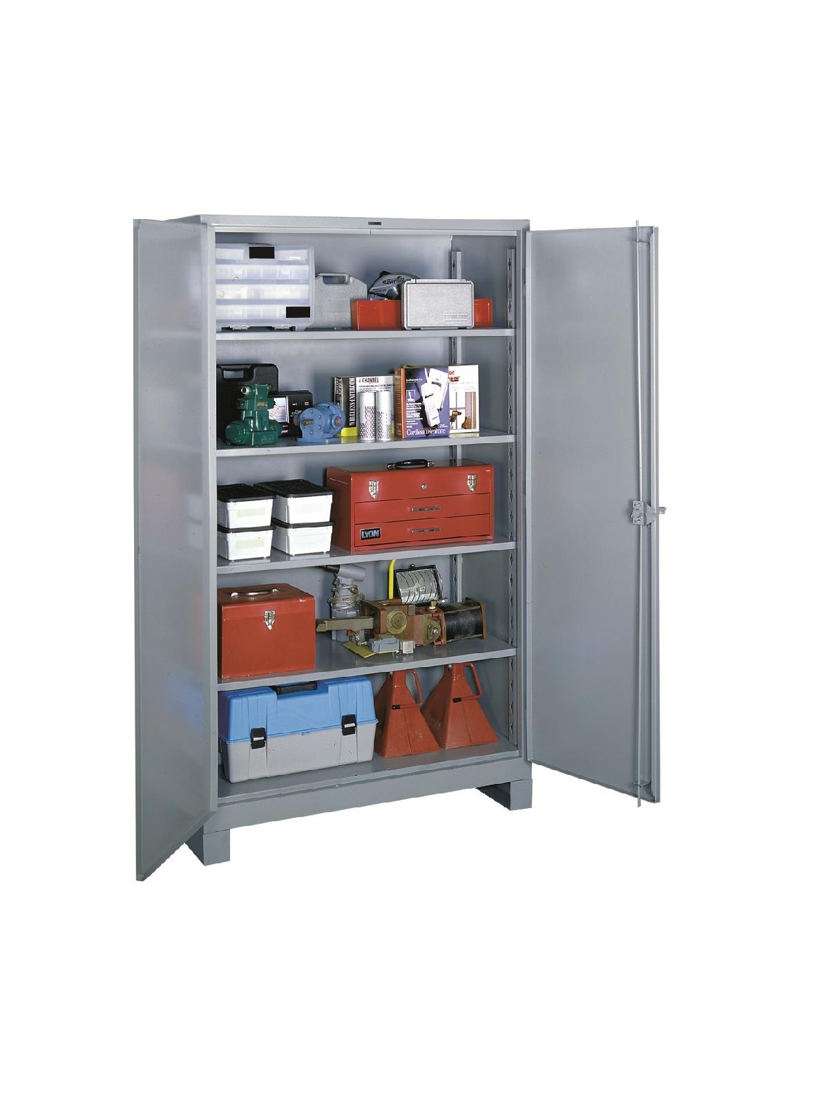 All-welded 14-gauge steel construction provides a payload capacity of 1,450 lbs. per shelf. Rugged cast iron handle features a 3/8" thick padlock hasp (lock not included) and 3 heavy-duty 5/16" brass pin hinge plates welded to each door. Secure, 3-point locking system on doors features 3/8" latch rod and 3/16" latch plate. Shelves bolt securely into welded keyhole slots and can be repositioned on 3" centers. Additional shelves are available - call for details. 4" high legs welded to cabinet create a forklift base. FOB Shipping Point.