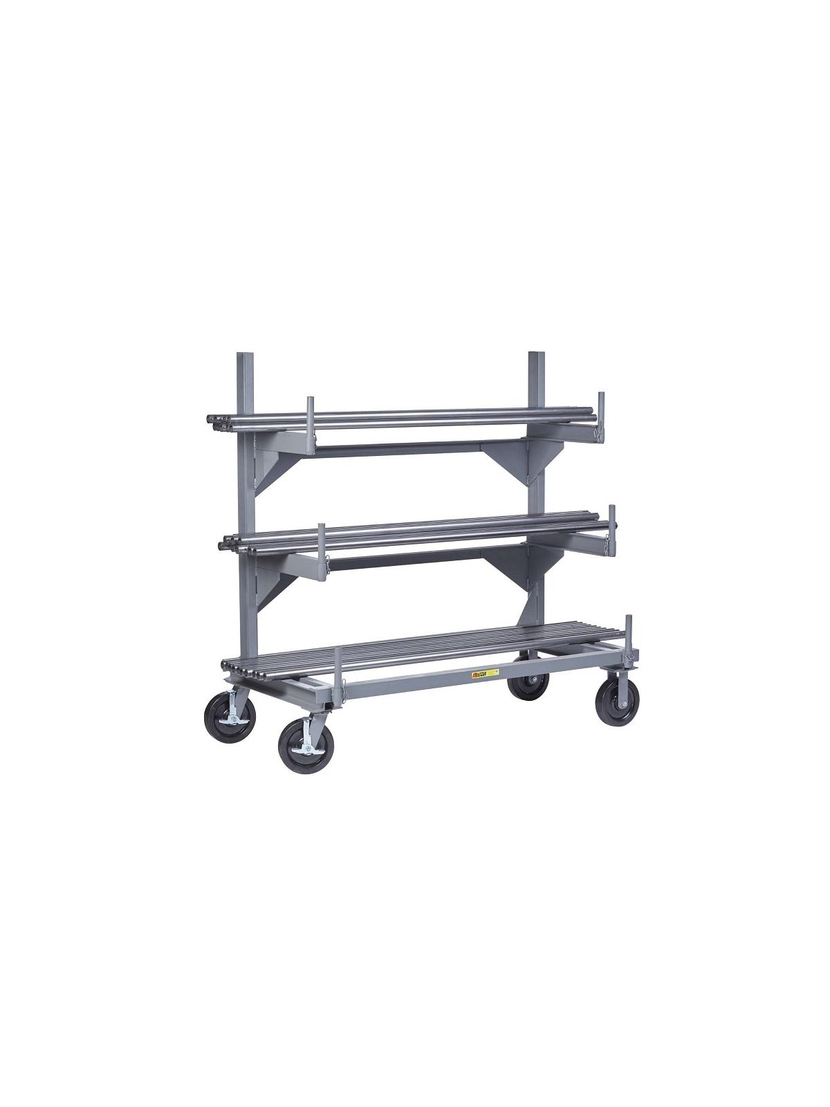 This single sided rack allows for efficient storage for bar stock, tubing, angles, and other long and bulky materials. The all-welded steel construction features structural channel frame, base and arms. Removable retainer pipes at ends of arms extend 5" high to provide secure load retention. Powder-coated finish. 1500 lbs. capacity per level, not to exceed 4000 lbs. overall. FOB Shipping Point.