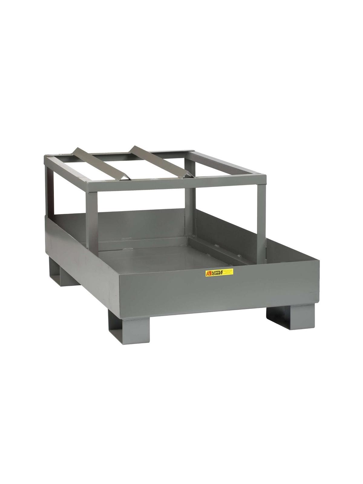 Heavy-gauge steel construction in a drum storage system that positions the drums ready for dispensing. 1-Drum unit has 33 gallon sump capacity and 2-Drum unit has 66 gallon sump capacity. Both include 4 way fork-liftable access. FOB Shipping Point.