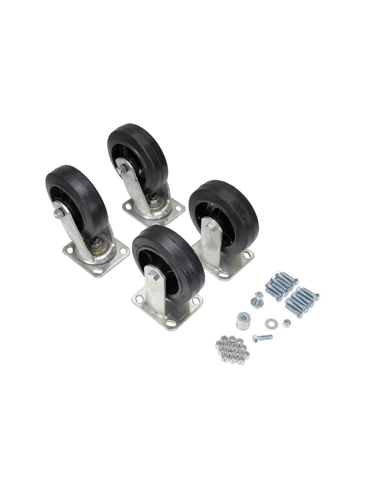 For use with Bumper Release Steel Hoppers. Transport loads with portable hoppers. The maximum weight capacity is the lowest weight capacity of either the hopper or the caster. Casters are shipped uninstalled to prevent freight damage. Sets include (2) rigid, and (2) swivel casters. Casters are bolted-on by utilizing the factory stamped hole in the fork tubes. FOB Shipping Point.