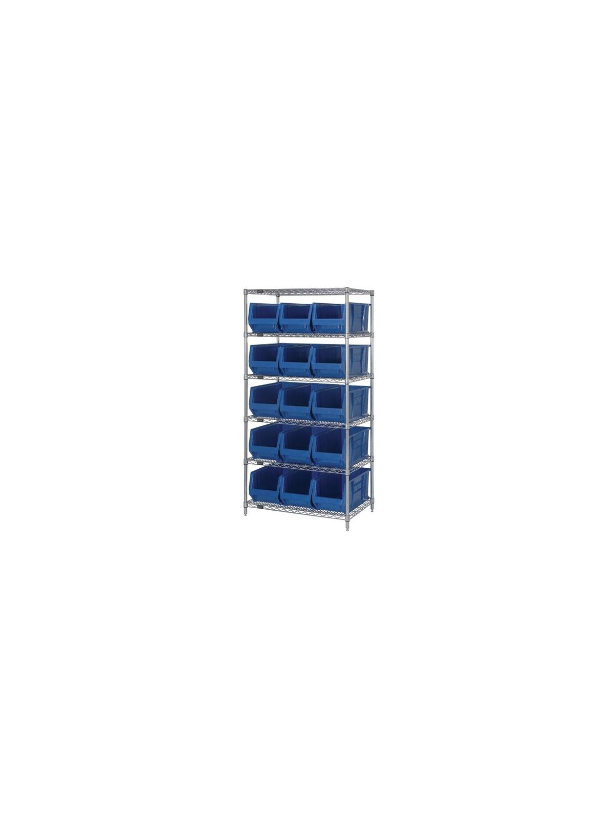 Combine stylish chrome shelving and parts organizing bins. Sturdy shelving unit supports loads up to 800 lbs. Choice of bins. Easy to assemble. Hulk Containers are available in Blue, Red and Yellow. FOB Shipping Point.