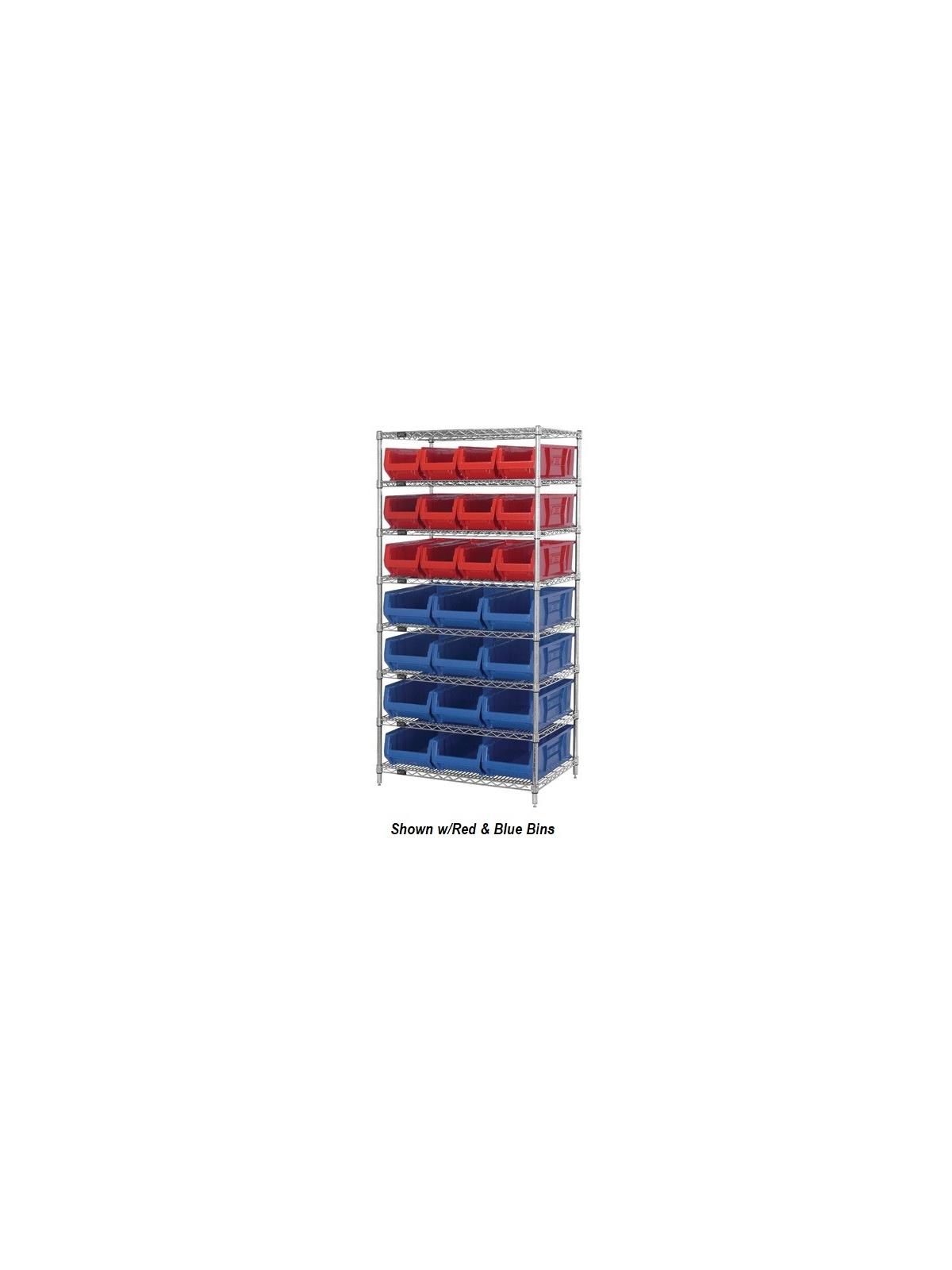 Combine stylish chrome shelving and parts organizing bins. Sturdy shelving unit supports loads up to 800 lbs. Choice of bins. Easy to assemble. Hulk Containers are available in Blue, Red and Yellow. FOB Shipping Point.