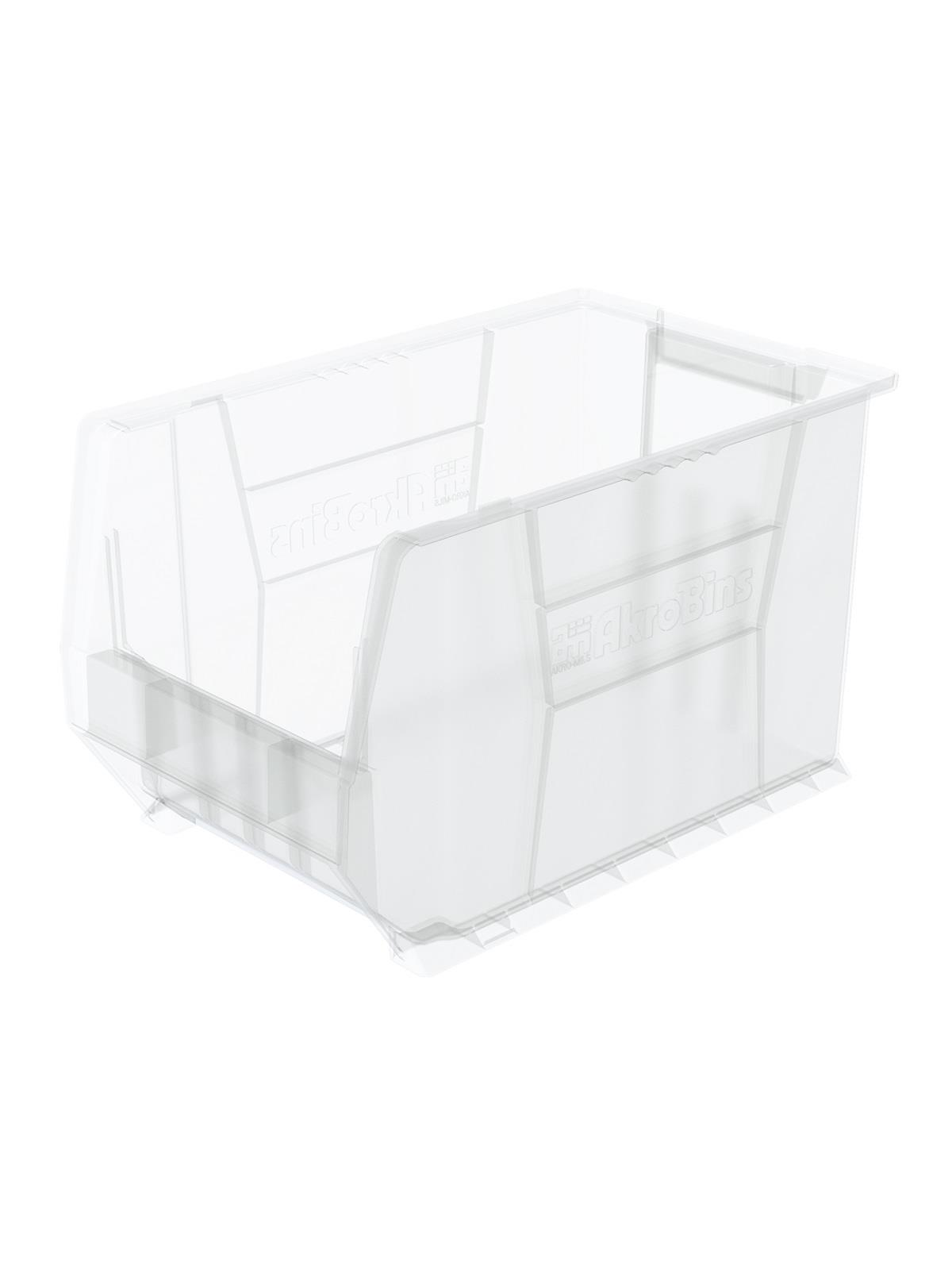 20", 24" and 30" Deep Clear Bins for Super-Size Storage. Large capacity storage bins for organizing heavy or bulky items. Heavy-duty bins molded in clear polypropylene. Extra large stacking containers feature anti-slide stop to prevent bins from shifting forward. Reinforced side ribs add strength and prevent spreading when stacked or loaded. Optional lids and dividers available. FOB Shipping Point.