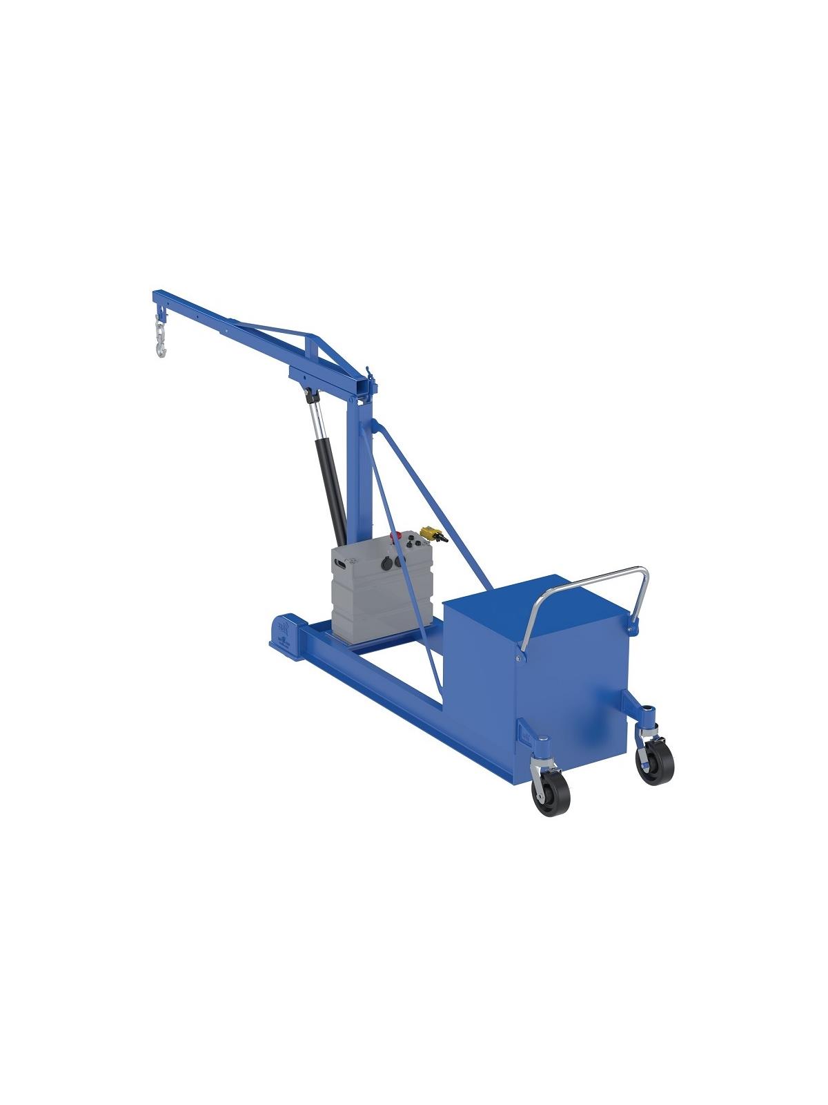 This crane has an adjustable boom to allow for maximum adjustments and versatility to lift a variety of loads. The boom is raised with a manual hydraulic hand pump or a push of a button on DC powered units. The boom also telescopes out for a greater reach. The counterbalance design eliminates the need for front legs, making the unit easier to maneuver and ideal for reaching tight, hard to reach areas. Units roll on two (2) rigid 8" x 2" glass-filled nylon and two (2) swivel 8" x 3" phenolic casters with side brake. FOB Shipping Point.