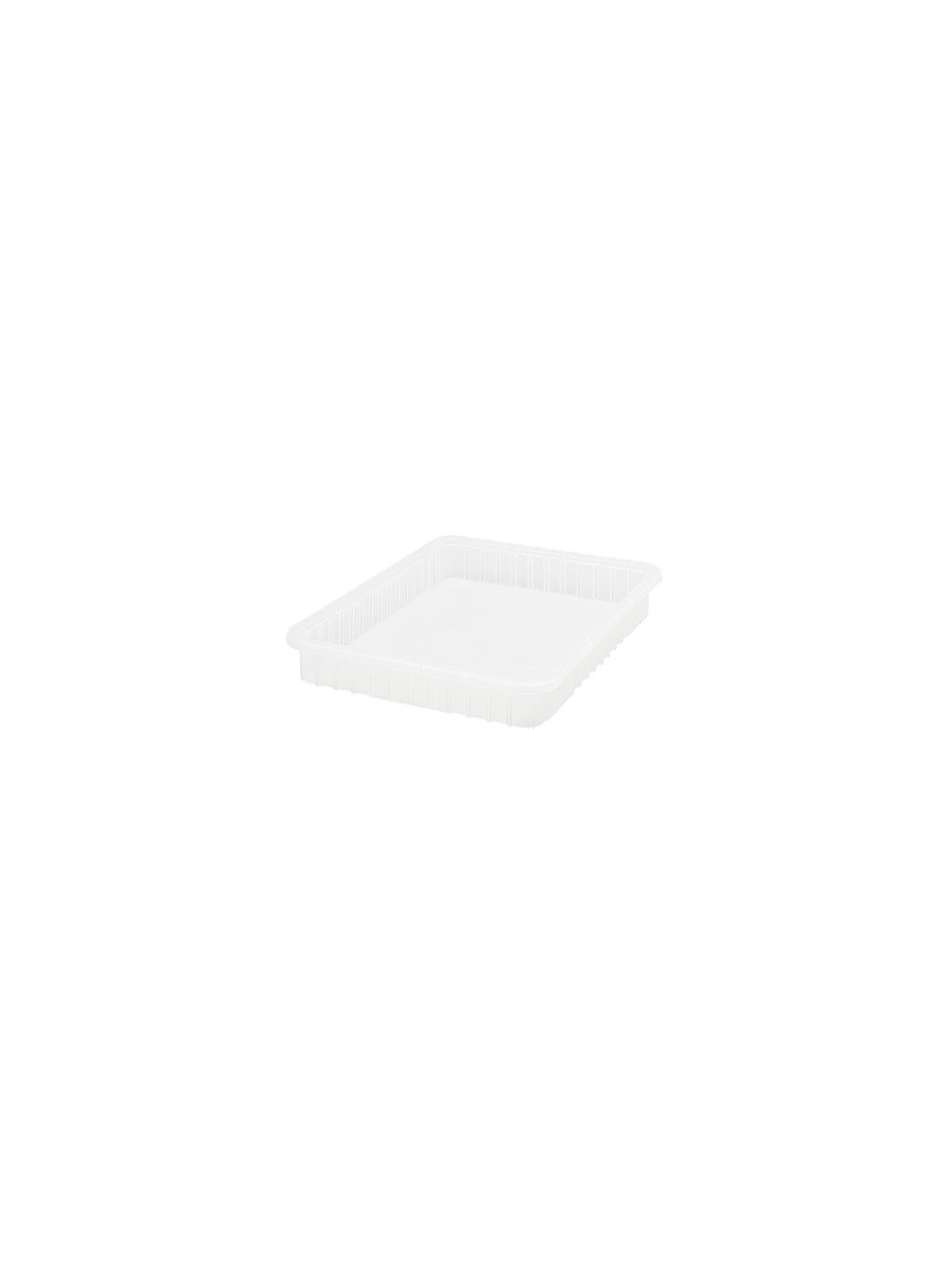 Can be used in industrial, commercial, electronic and health care industries for storage, assembly, fabrication and distribution applications. Compatible with most racks, shelving and automated, material handling equipment. Stacking rims and multi-ribbed external sides provide high impact strength. Large, smooth surface area on all four sides for content identification. Molded-in stacking ridge assures containers will stack securely with or without covers (covers sold separately). Available in Blue, Red, Gray or Clear. FOB Shipping Point.