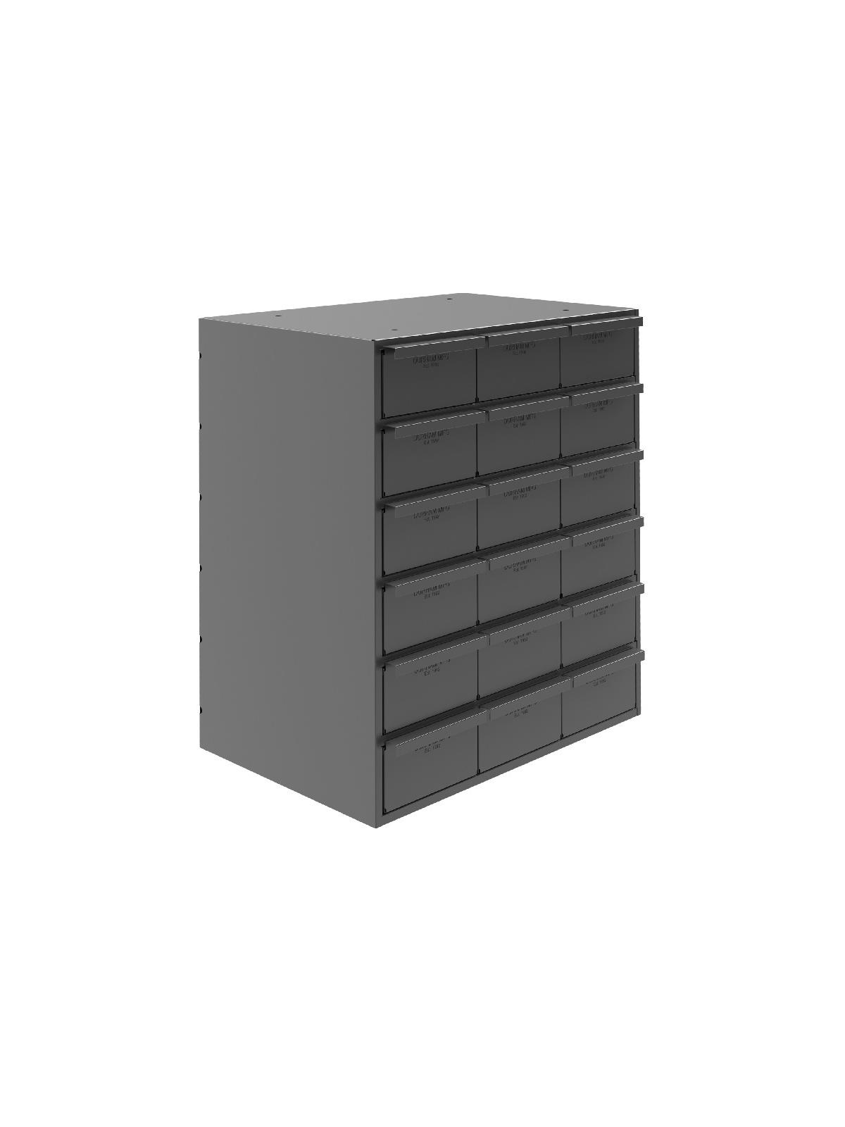 All-welded heavy-duty frame features vertical support for extra stacking strength. A positive stop mechanism prevents drawers from falling out. Drawers also feature double interlocked design for additional rigidity. Full-width handles for a firm grip. Each drawer complete with 2 adjustable dividers. Extra dividers sold below. Fits standard shelving. Finished in rust and acid resistant Gray powder coat. Fully assembled. FOB Shipping Point.