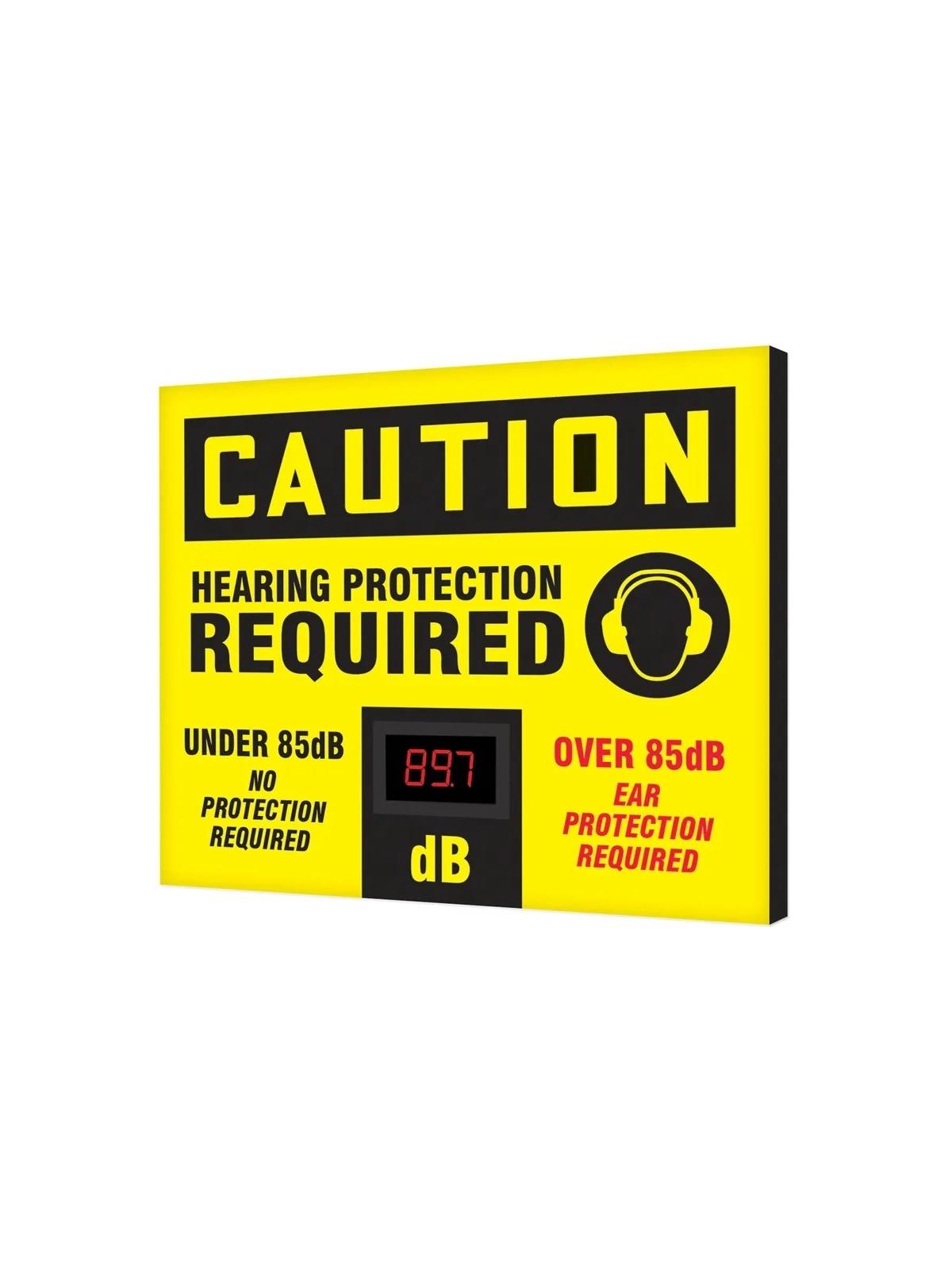 Electronic decibel meter signs constantly measure and display decibel level for employee safety. Encourage workers to use ear protection when sound levels are elevated and become a hazard to them. Striking visual edge safety sign captures employees' attention. Supports OSHA Standard 1910.95 that states employers must have in place an effective hearing conservation program whenever noise exposure equals or exceeds 85 db for 8 hours. FOB Shipping Point.