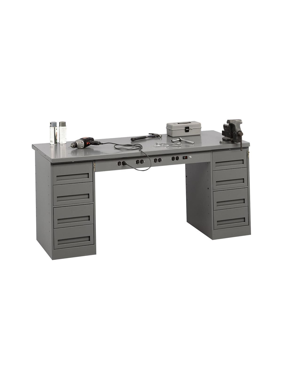 Drawers have an adjustable divider.  Full depth shelf in door cabinet is adjustable in 1-1/8" increments. Front panel has knockouts for four duplex outlets and a switch (order optional wiring kit - See Related Items tab). Choice of tops: 1-3/4" thick solid hardwood butcher-block top or 1-1/2" thick steel top. Shipped unassembled (cabinets may be installed on either side). Medium gray. FOB Shipping Point.