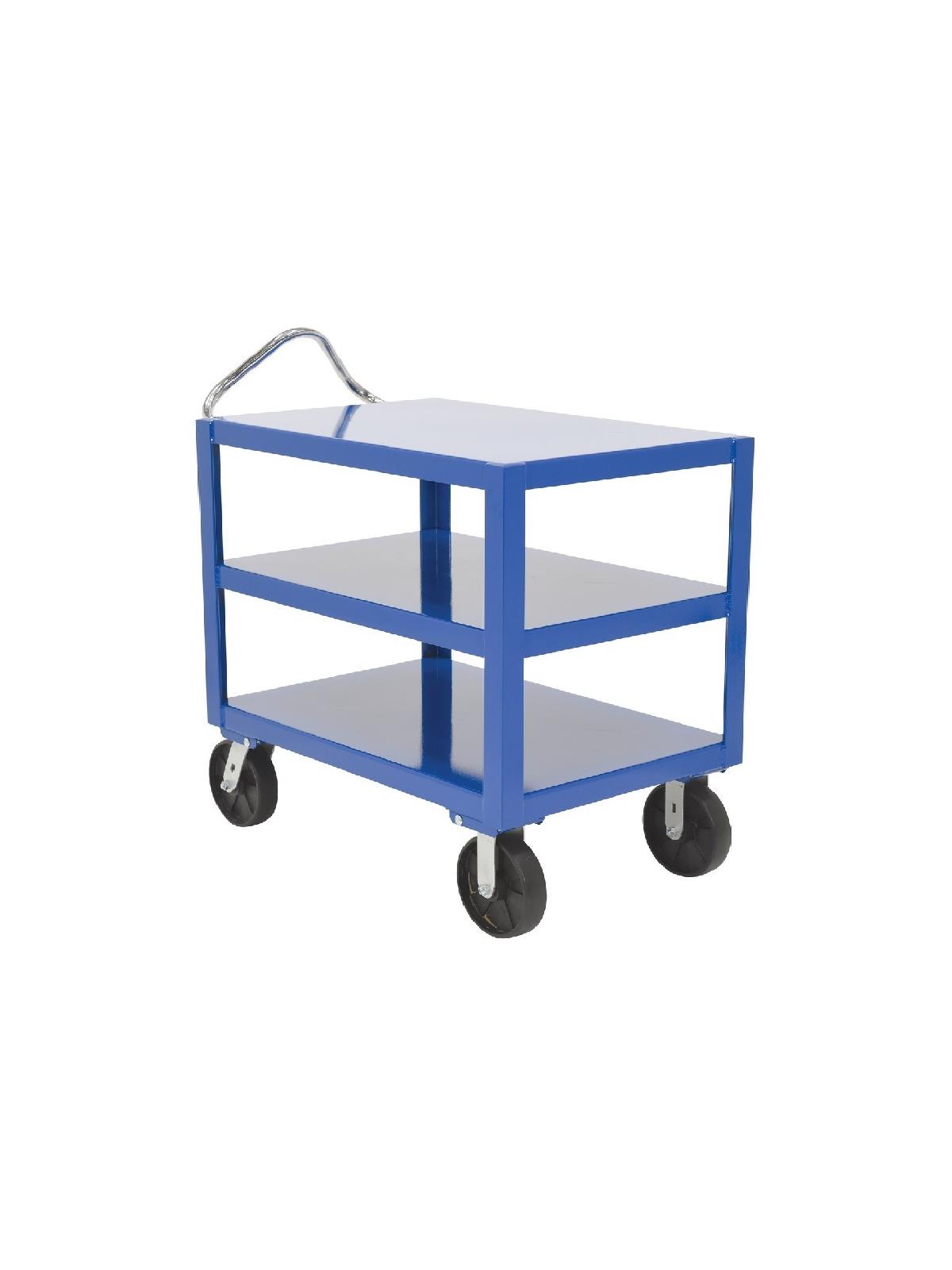 Constructed of heavy-duty steel to handle uniform loads up to 4,000 pounds. The patented ergonomic handle decreases fatigue by allowing the operator to easily maneuver the cart. Handle can be inverted for individual height comfort. Rolls on 8" x 2" casters, two (2) rigid and two (2) swivel with roller bearings. Many caster styles to choose from. Additional sizes available.  FOB Shipping Point.