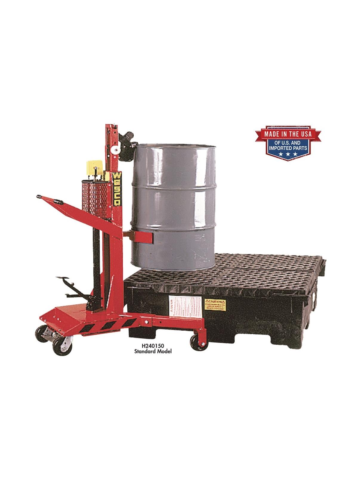The ergonomic solution for lifting, transporting and placing drums on spill pallets. No need for the operator to touch the drum to raise, transport and lower. Features 1100 lb. capacity hydraulic jack for easy lifting of steel, poly, and fiber drums -- lifts 1" per stroke. Spring loaded grip holds any rimmed drum. Handles most 30, 55, and 85 gal. drums. Ergonomic design allows drums to be easily raised 20" above the floor. Swivel 5" x 2" phenolic casters for easy movement. Choose from five models - Standard, High Reach, Scale, Power Lift & Drive. FOB Shipping Point.