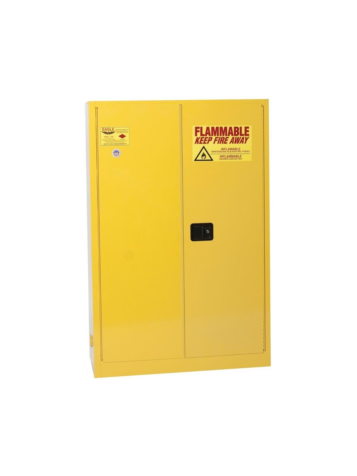 Eagle flammable storage cabinets come in yellow high gloss powder finish with red warning, grounding attachment, 3-point key lock, and 2-inch raised leakproof door sill. Each shelf is adjustable, supported by four brackets, and can support 350 pounds. All our metal cabinets meet NFPA Code 30 and OSHA requirements. Flammable cabinets help keep flammable liquids near work areas safely. Constructed of 18-gauge steel, all cabinets feature reinforced double-wall construction with air space on the sides, top, bottom, back and doors. Flammable cabinets, also known as fire cabinets, come in standard design, tower cabinets with legs, wall mounted cabinets, under counter cabinets, and add-on cabinets. FOB Shipping Point.