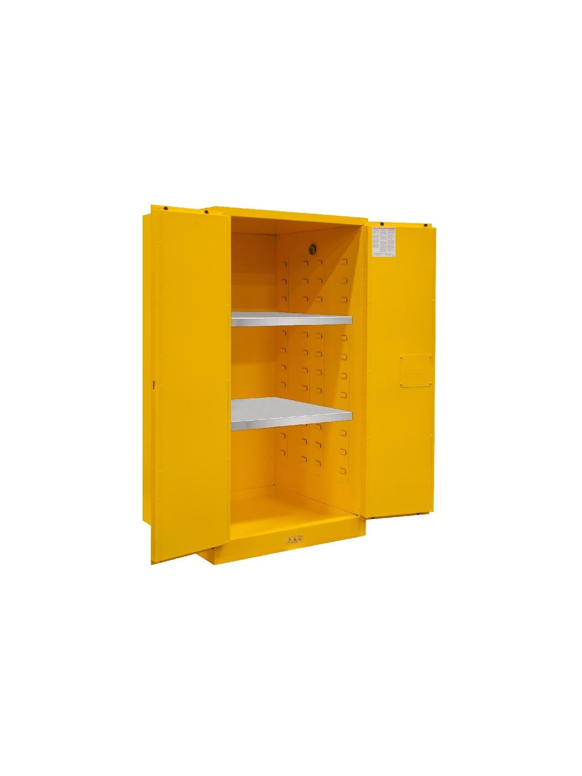 Flammable Storage Cabinets are required by OSHA and UFC in commercial and industrial facilities where flammable liquids are used and stored. Cabinets feature recessed lockable paddle latch and 3 point locking systems which greatly improves security. Bunged air vents on each side of the cabinet allows for greater ventilation. Constructed of all welded Heavy Duty Steel.