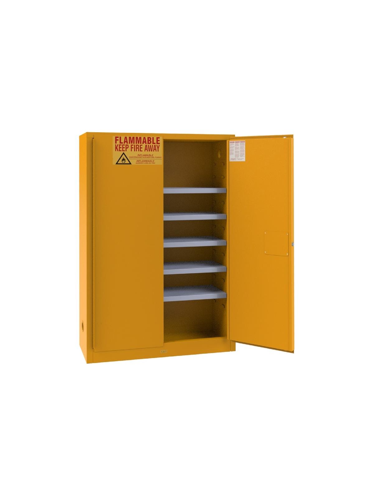 Flammable Storage Cabinets are required by OSHA and UFC in commercial and industrial facilities where flammable liquids are used and stored. Cabinets feature recessed lockable paddle latch and 3 point locking systems which greatly improves security. Bunged air vents on each side of the cabinet allows for greater ventilation. Constructed of all welded Heavy Duty Steel.