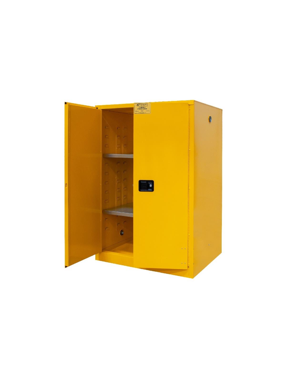 Flammable Storage Cabinets are required by OSHA and UFC in commercial and industrial facilities where flammable liquids are used and stored. Cabinets feature recessed lockable paddle latch and 3 point locking systems which greatly improves security. Bunged air vents on each side of the cabinet allows for greater ventilation. Constructed of all welded Heavy Duty Steel.