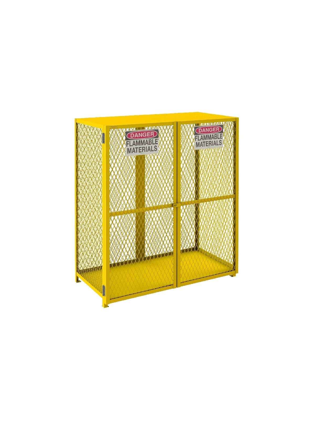 Lockable cabinets store cylinders of fuel, LP gases and other flammable materials on easy-to-access cylinder cradles. "DANGER FLAMMABLE MATERIALS" signs on each door. Magnetic catch keeps doors safely shut when not locked. Heavy-duty butt hinges keep doors from sagging. Includes padlock hasp to secure contents - padlock not furnished. Made of sturdy 1-1/2" x 1/8" angle iron frame. Pre-drilled holes for lagging to floor. Durable, rust and acid resistant safety Yellow powder coat finish. When used properly, units are in full compliance with OSHA and NFPA standards. FOB Shipping Point.