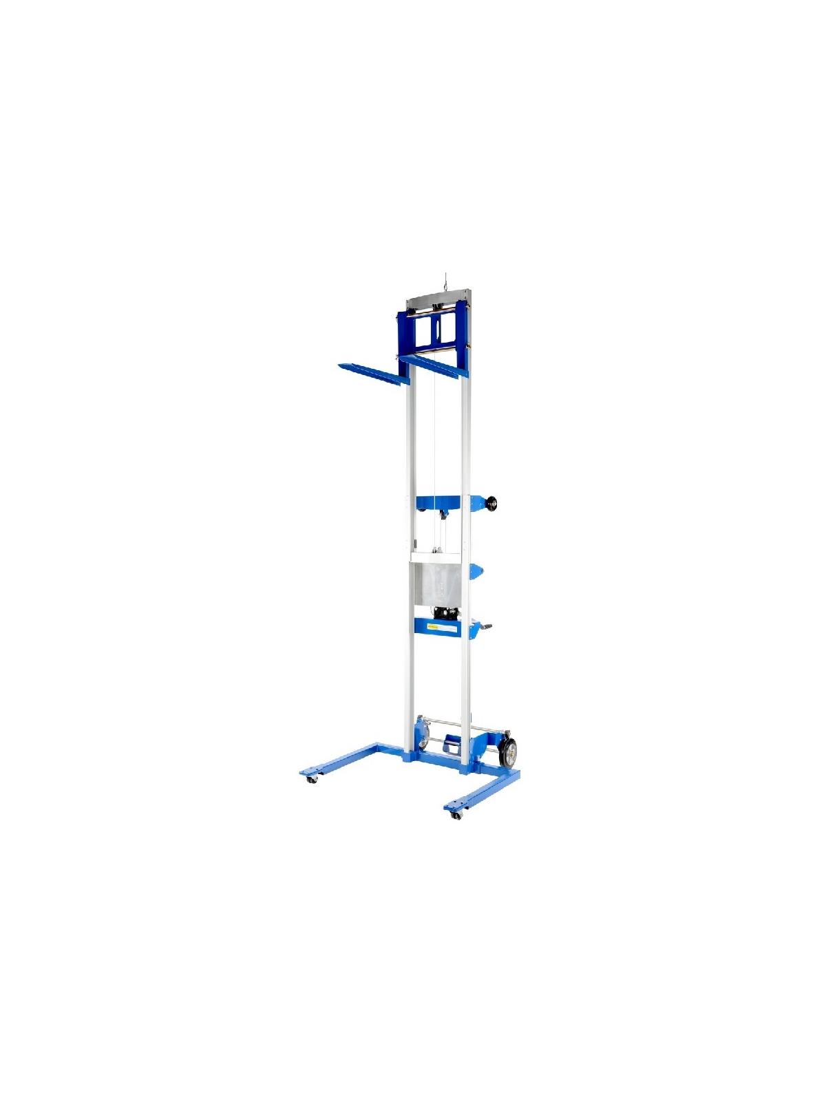 Operated by a hand-crank winch that features a reversible handle and a hold-down device for securing the carriage during transport. Forks can be inverted to provide 2 different heights. Rugged thick steel forks are 4"W x 1-3/4" thick and forks measure 20-1/2"W x 22"L overall. Truck is made of durable steel-and-aluminum. Two 8" non-marking rear wheels, two 2" front swivel casters. Counter balanced design has poly-on-poly wheels, (2) 5" rear swivel wheels, (2) 4" front wheels. Models ending with 'HP' and 'EHP' suffixes have extended height capabilities. These units have a 2 stage mast system and a telescoping inner mast frame, giving the user the ability to extend the forks above the height of the first mast. FOB Shipping Point.