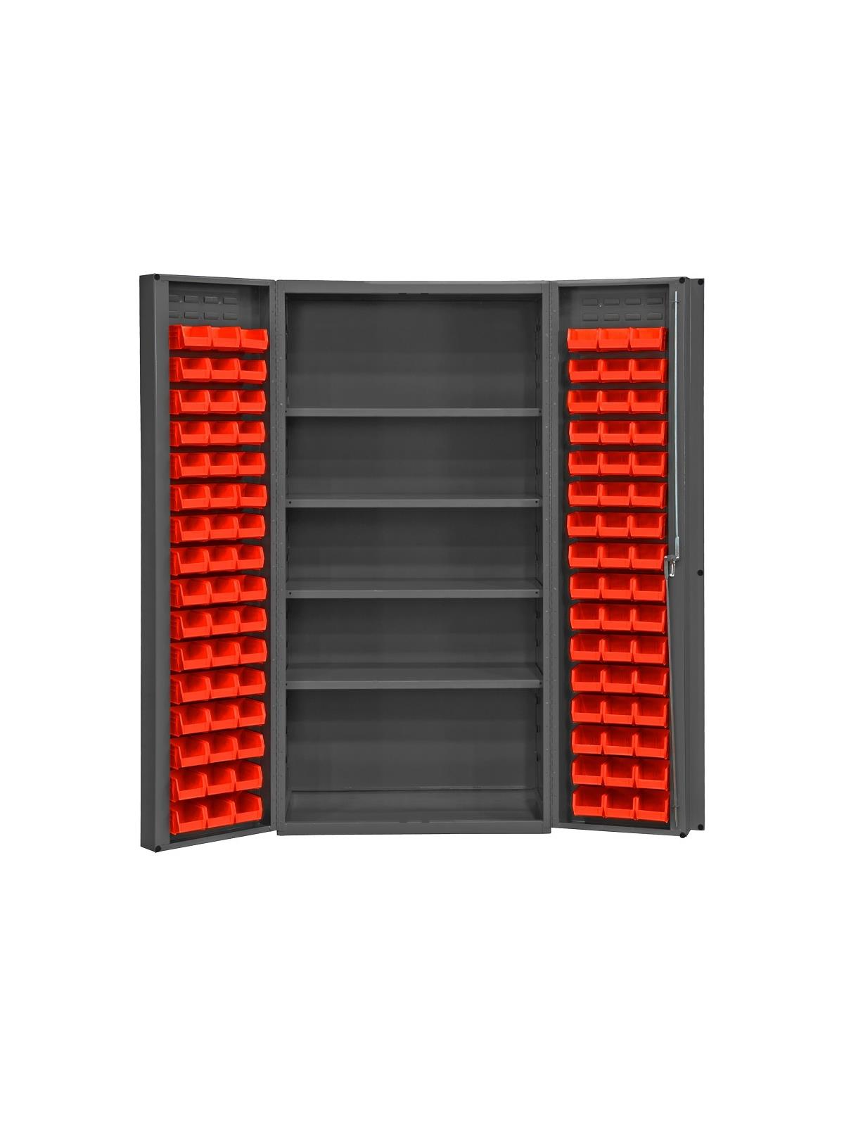 Heavy-duty, all welded 14 gauge steel construction. 3-point locking handle with 5/16" dia. rods and a provision for padlock. Models HJC-171, HSSC-227, and HSSC-185-3S have 6" high box style legs which offer space for lift truck forks making the entire units forkliftable and can be lagged to the floor. Legs are constructed of 3/16" steel. All cabinets feature heavy-duty leaf hinges to prevent warping and sagging. Fully loaded doors can hold up to 650 lbs. Finished in durable Gray powder coat. FOB Shipping Point.
