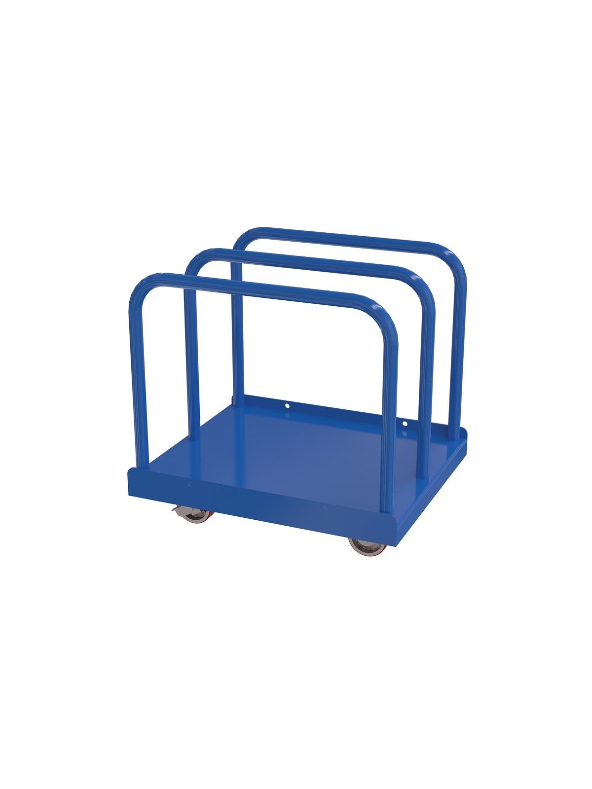 Heavy-Duty Panel Cart is the perfect panel cart for transporting plywood, drywall, paneling, doors, etc. Baked-in-powder-coated blue finish for toughness. Features a side retainer lip that keeps cargo on the deck. Two rigid and two swivel with brakes 5 x 2" poly-on-steel casters included. Overall height is 34". FOB Shipping Point.