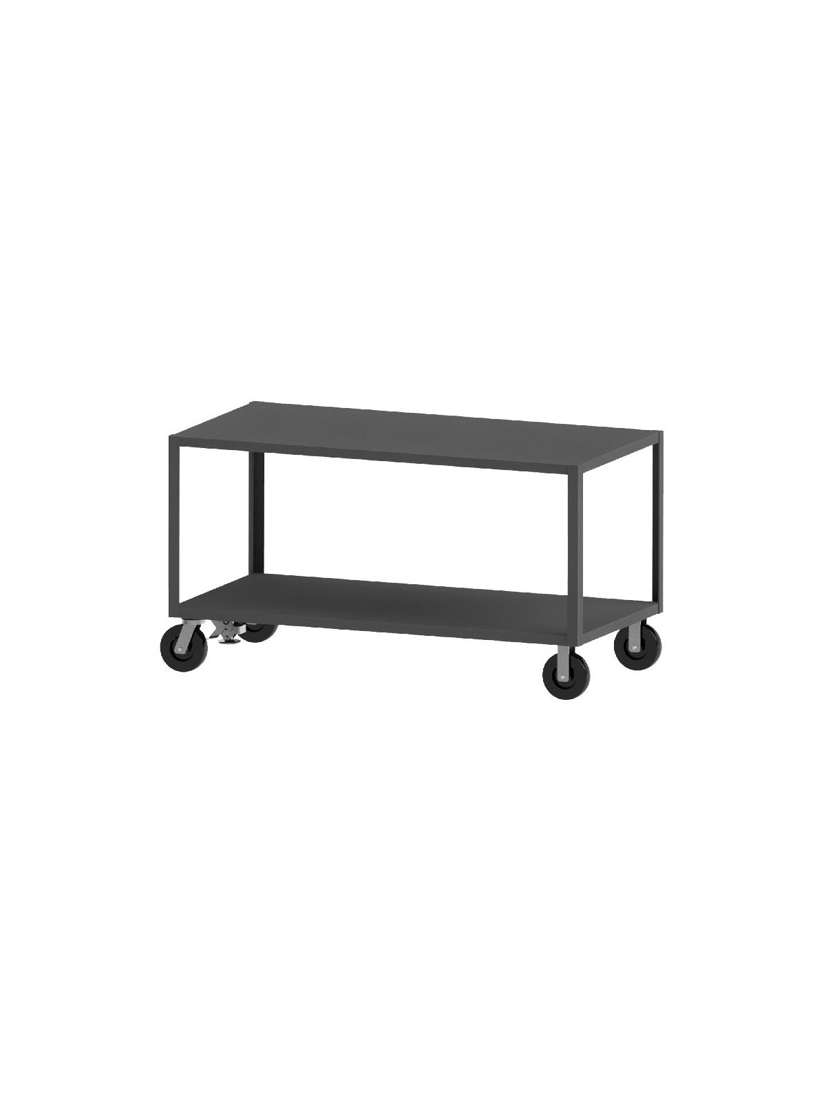 Heavy Duty Portable Tables have a 2" x 3/16" angle iron frame for added strength. Shelves are reinforced and have lips down. (2) swivel and (2) rigid bolt-on casters. Sturdy tubular push handle for easy maneuverability. 4,000 lbs. capacity unit has welded 14 gauge steel shelves with channel formed sides. 5,000 lbs. capacity unit has welded 12 gauge steel shelves. FOB Shipping Point.