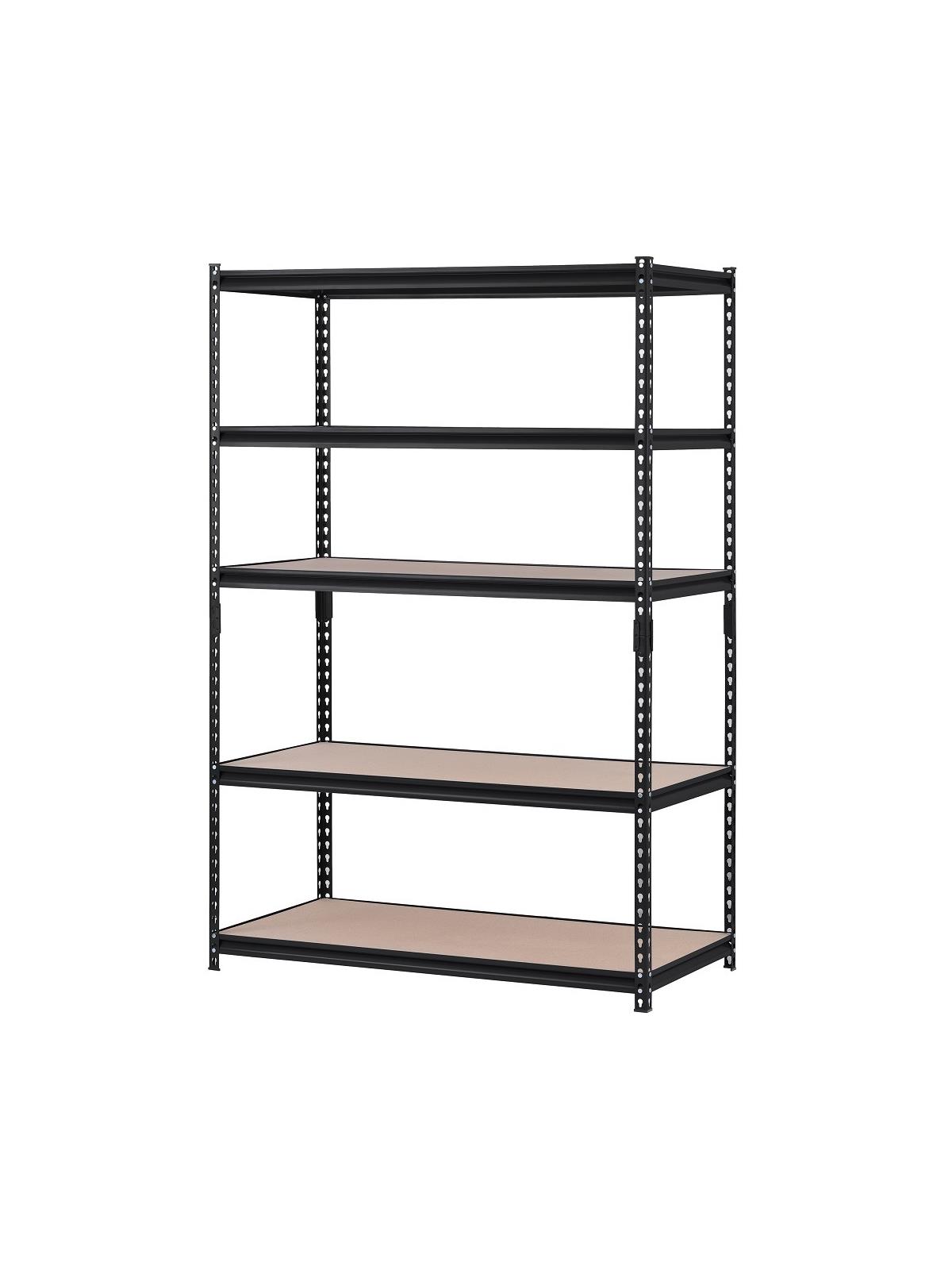 Shelves adjust in 1-1/2" increments to accommodate different size items. Each shelf holds up to 800 lbs. weight capacity, when evenly distributed. Includes particleboard decking. Can also be assembled horizontally as two separate work height units. Durable powder coated black finish. FOB Shipping Point.