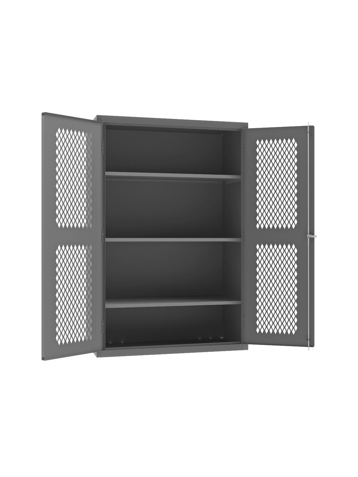 Punched diamond pattern in doors allows content visibility and ventilation. 3-point locking system with keyed handle and lock rods. 4 keys included. Full height, formed and recessed doors with heavy duty, leaf hinges to prevent sagging and warping. Adjustable shelves rest on louvered uprights and adjust on 4" centers (no tools required). Durable, gray, textured powder coat finish. FOB Shipping Point.