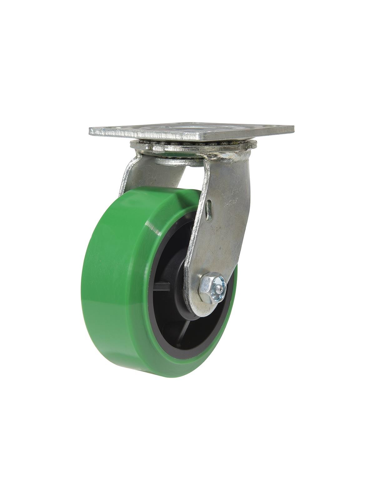 Made of professional grade polyurethane, designed with a new liquid cast flow affusion that ensures a 100% bond to core and 0% trapped air. The unique formula assists in avoiding disintegration that can occur in most plastic wheels, and provides five times longer wheel tread life than standard polyurethane. This caster is resistant to oil, grease, water and most solvents. Top plate size 4" x 4-1/2". FOB Shipping Point.