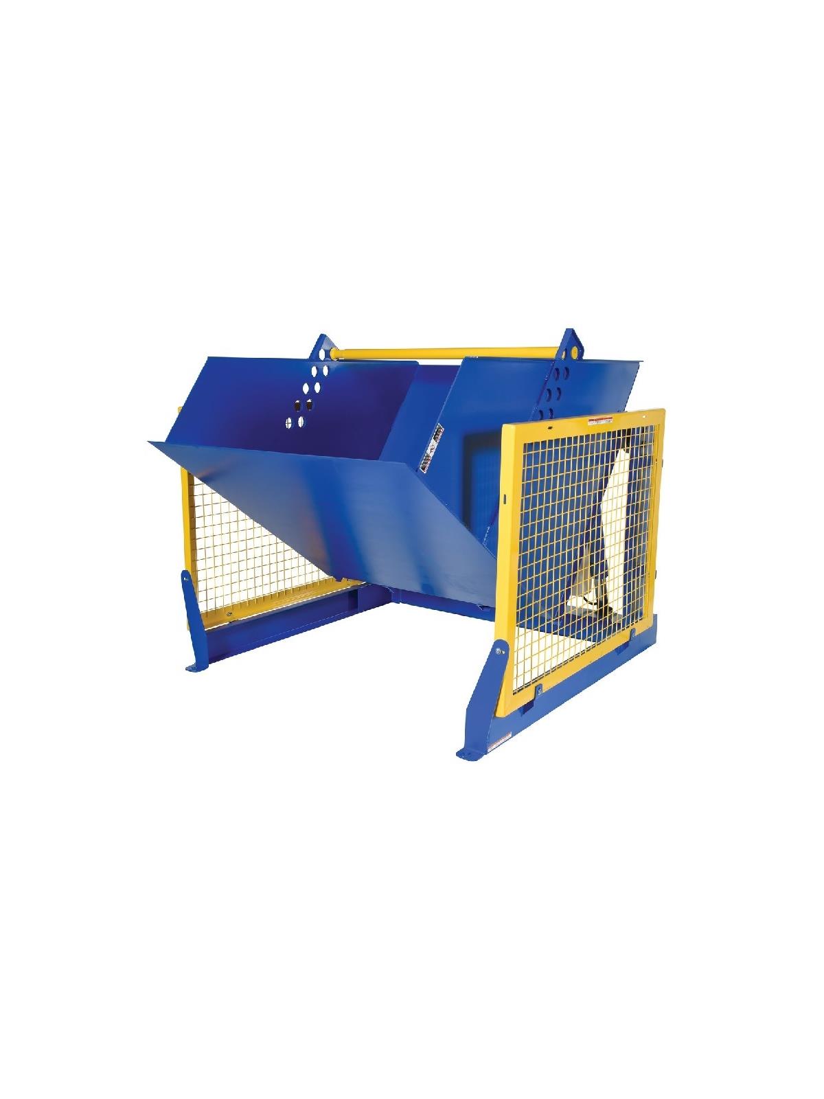 This ultimate dumper has advanced features from solid all welded steel construction to the Emergency Brass Velocity fuse in the cylinder. Main components include a 24V hand held pendant control, 56 frame motor, upper travel limit switch to reduce wear on the components. Safety features include: side rail guards, floor hold down brackets, adjustable hold down bar, 3,000 psi hydraulic component rating, integrated brass velocity fuse mounted inside the cylinder. Maximum rotation is 135°, yielding a 45° dump angle. Painted Royal Blue. FOB Shipping Point.