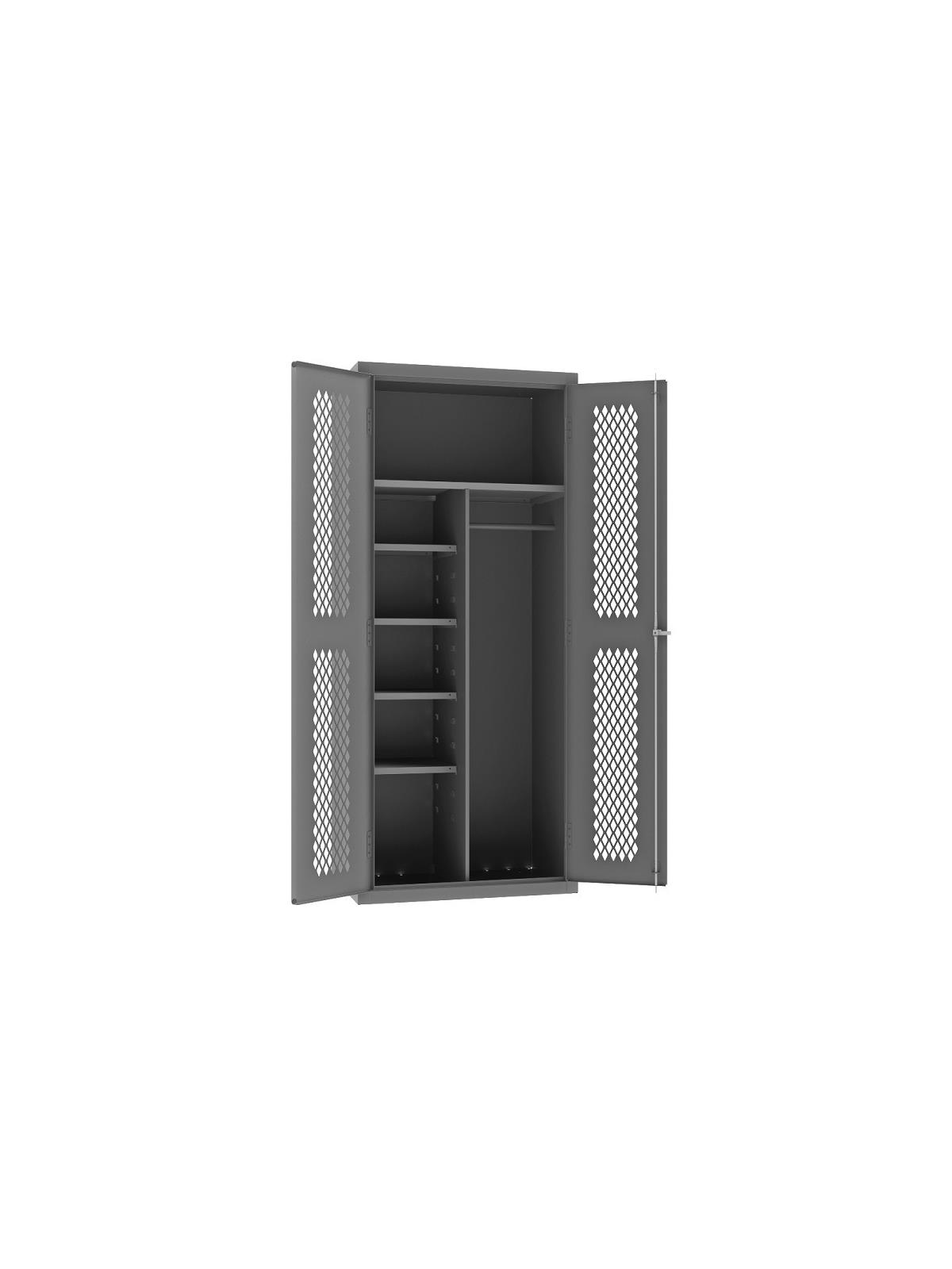 HEMDC model doors and sides feature punched diamond pattern allowing for quick visibility and ventilation of contents. 3-point locking system with keyed handle and lock rods, 4 keys included. Full height, formed and recessed doors with heavy duty leaf hinges to prevent sagging and warping. Hanger bar for uniforms, jackets, etc. Ample space for broom storage. Adjustable shelves adjust on 4" centers. No tools required for installation. Durable, gray, textured powder coat finish. FOB Shipping Point.