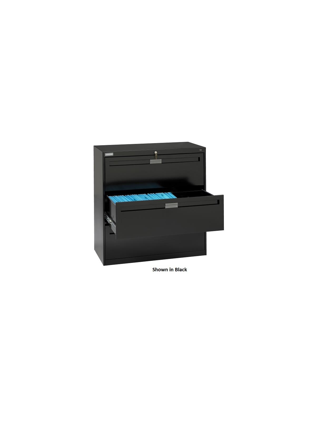 Drawers and doors have easy grip, full-width pulls with recessed label holders. Four leveling glides allow the unit to be leveled on uneven floors. To reduce risk of tipping, order two drawer lateral files with counterweights (suffix "W") for all applications except under a work surface in a workstation. Five and six-high units have retractable door(s) with roll-out drawer on top opening(s). Durable powder-coat paint finish. Available in Light Gray, Medium Gray, Putty, Sand and Black. FOB Shipping Point.