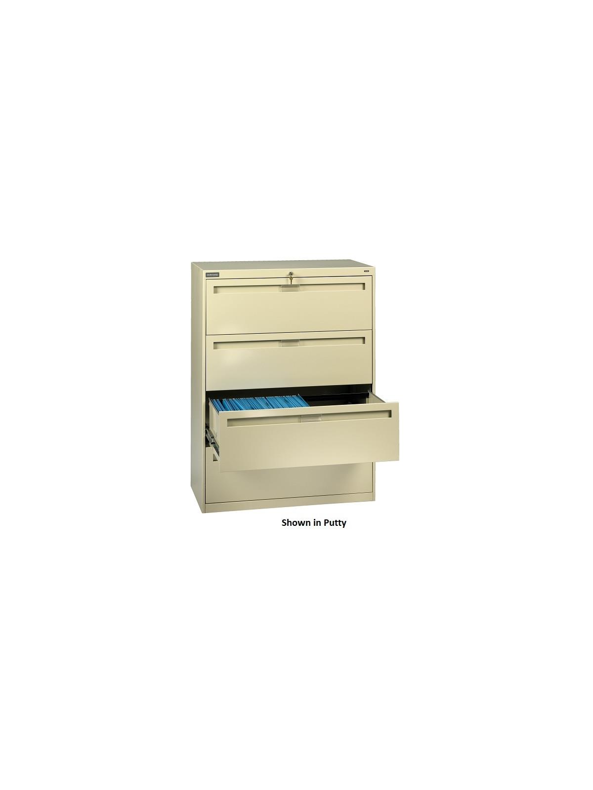 Drawers and doors have easy grip, full-width pulls with recessed label holders. Four leveling glides allow the unit to be leveled on uneven floors. To reduce risk of tipping, order two drawer lateral files with counterweights (suffix "W") for all applications except under a work surface in a workstation. Five and six-high units have retractable door(s) with roll-out drawer on top opening(s). Durable powder-coat paint finish. Available in Light Gray, Medium Gray, Putty, Sand and Black. FOB Shipping Point.