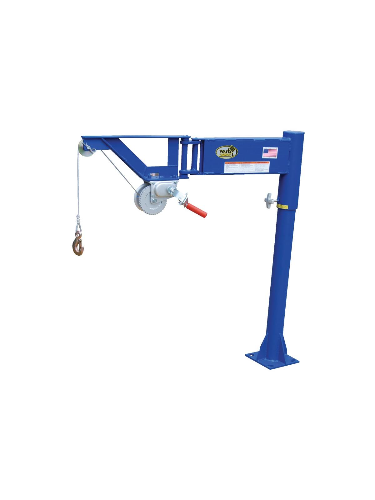 Hand crank winch is standard-powered winch optional. Van floor to raised hook height is 36-1/8". Swing reaches 0" minimum to 39-3/4" maximum. A back and time saver. Mounting plate is 8" x 8". HVAN-J-DC includes battery powered winch with 46' of cable. FOB Shipping Point.