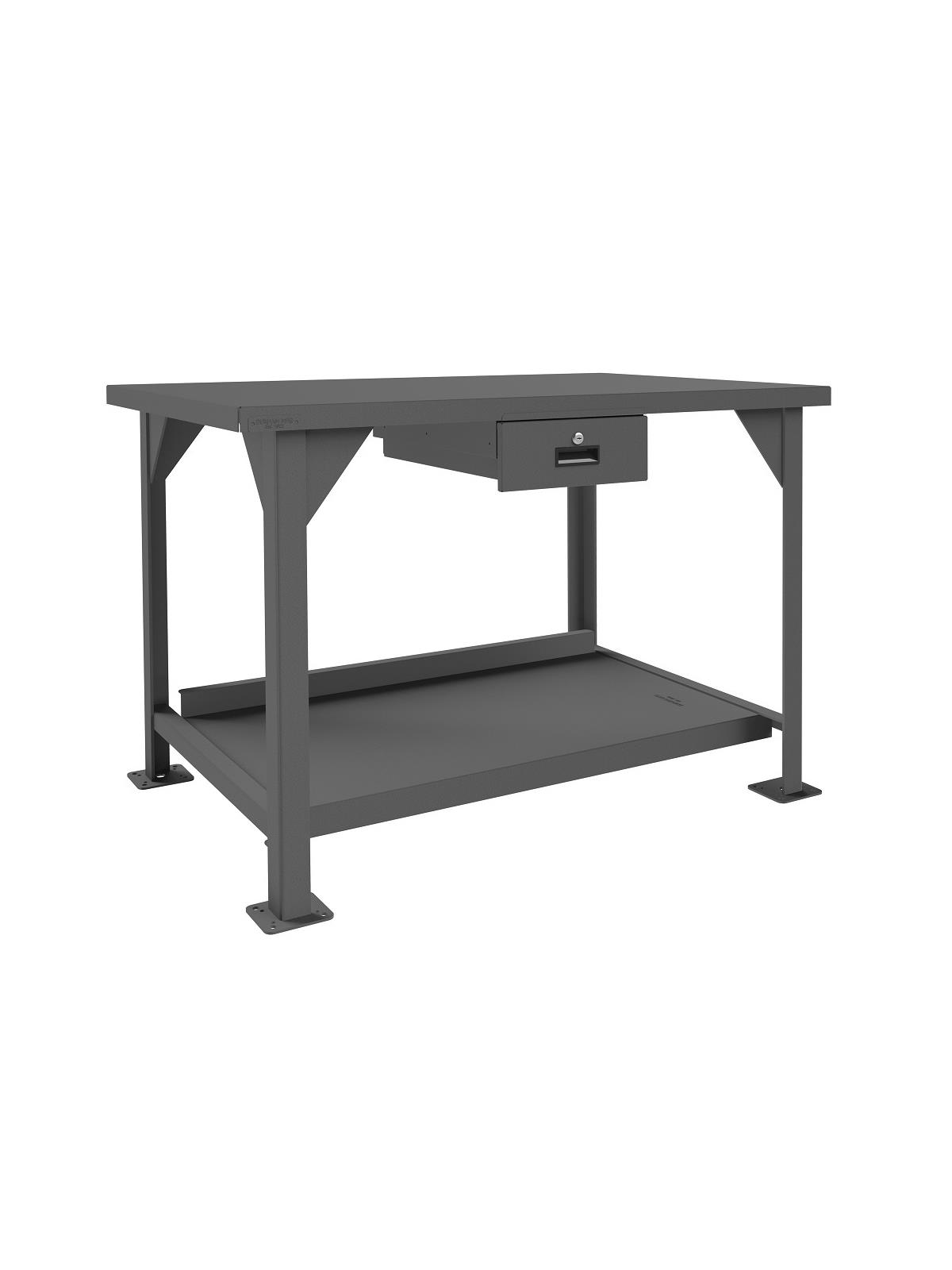 Workbench top is 12 gauge thick reinforced steel. Has angle iron stiffener under work surface and 2" x 2" x 1/4" angle iron legs. Mobile units (DWBM) include (4) 3" phenolic, locking swivel casters. Back and end stops. All units have provisions for optional drawer to be added. Work surfaces are 34" above the floor. All models include a 12 gauge steel lower shelf with 500 lbs. capacity. Foot pads with predrilled holes allow for lagging to the floor. FOB Shipping Point.