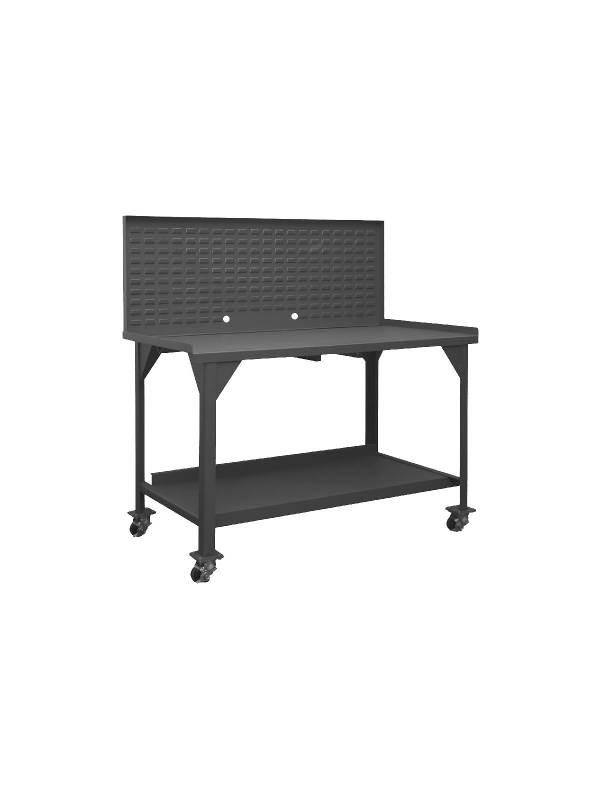 Workbench top is 12 gauge thick reinforced steel. Has angle iron stiffener under work surface and 2" x 2" x 1/4" angle iron legs. Mobile units (DWBM) include (4) 3" phenolic, locking swivel casters. Back and end stops. All units have provisions for optional drawer to be added. Work surfaces are 34" above the floor. All models include a 12 gauge steel lower shelf with 500 lbs. capacity. Foot pads with predrilled holes allow for lagging to the floor. FOB Shipping Point.