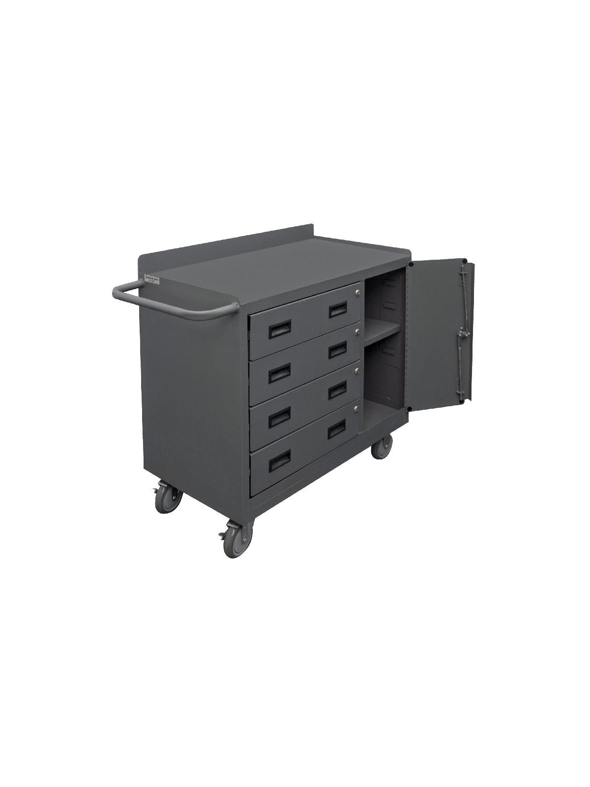Unit features back and end stops on the work surface. Bolt-on 5 x 1-1/4" polyurethane casters, 2 swivel and 2 rigid with side brakes. Cabinet compartment comes equipped with one adjustable shelf and a keyed handle with 3 point locking system. Models with -TH in the part number include a work surface with 1/4" thick tempered hardboard. Drawers measure 20-7/16" W x 14-11/16" D x 5-7/8" H. Ships fully assembled and ready to use. FOB Shipping Point.