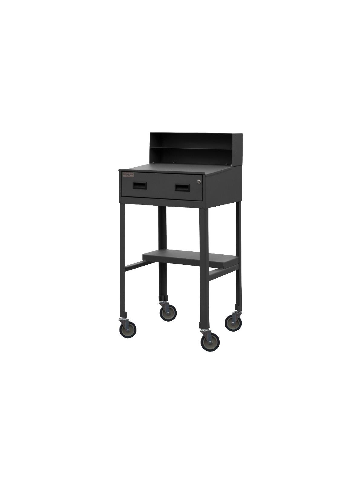 HMSD-2023-95 - Features a sliding drawer with cylinder lock and compartments for storing pens, pencils and more. Lip at base of work surface keeps items from falling off the sloped top. Rolls on four 3" rubber swivel plug-in casters. Gray powder coat finish. Shipped assembled and ready for use.