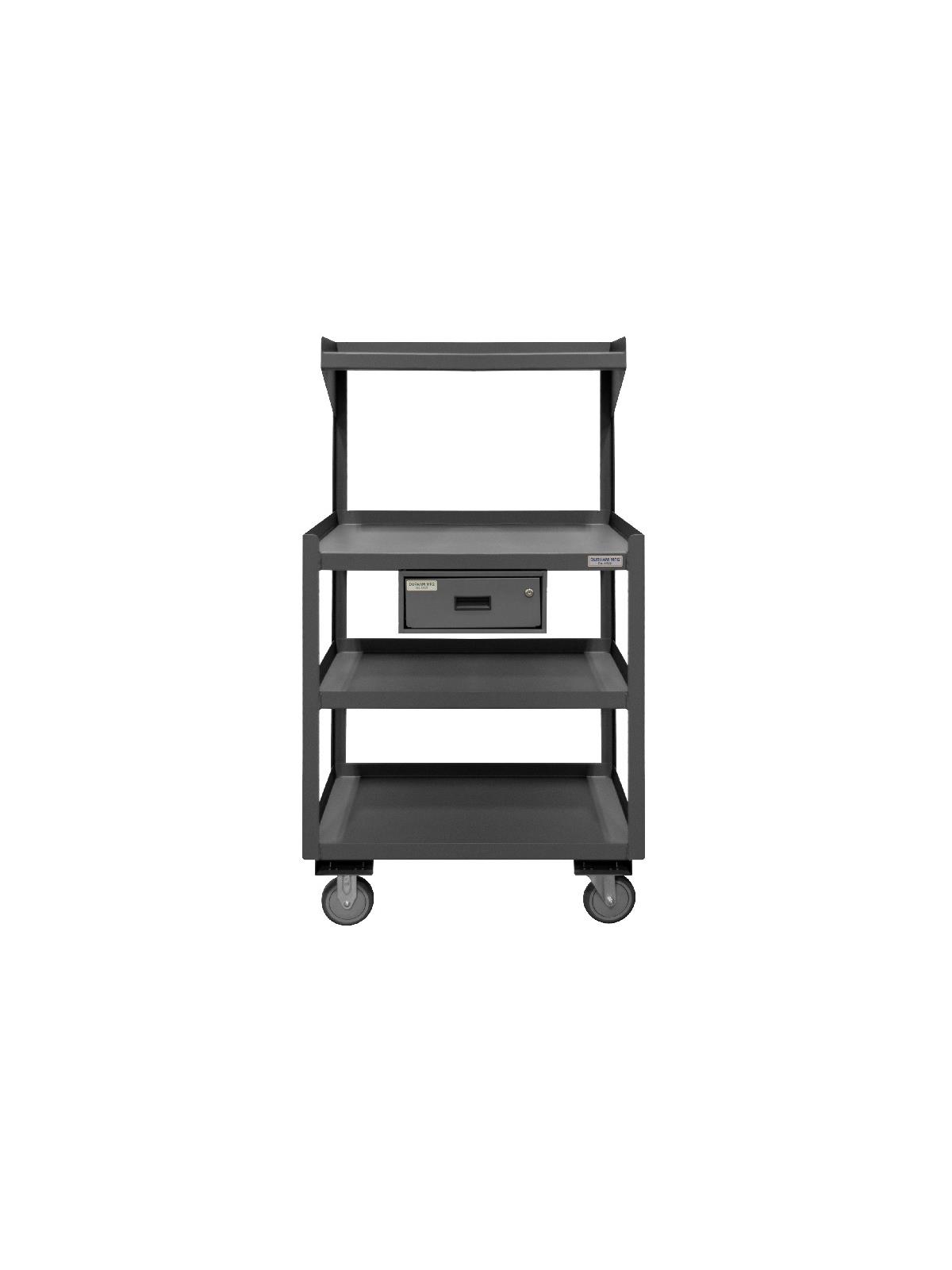HPSD-2430-4-D-95 - Features a sliding drawer with cylinder lock. Top shelf has front lip bent down with sides and back bent up. Center and bottom shelves have all side lips bent up to prevent items from falling off. Rolls on 5 x 1-1/4" polyurethane casters (2 rigid, 2 swivel). Gray powder coat finish.