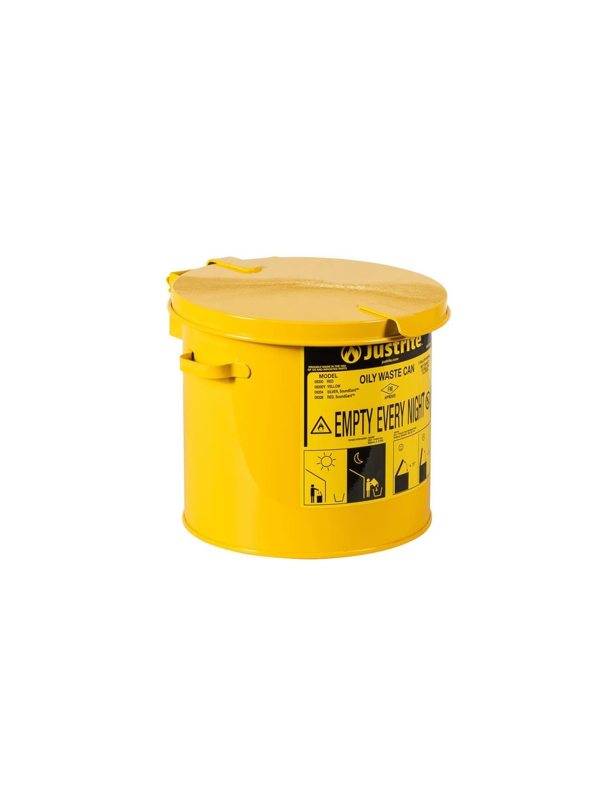 Oily Waste Cans are essential wherever solvent soaked rags and wipes are used. Durable galvanized steel body with carrying handle has a self-closing cover that stays closed when not in use to isolate contents from fire sources and limits oxygen to prevent spontaneous combustion. Raised, flow-through base encourages circulation of air to disperse heat and moisture. Silver color features SoundGard quiet-closing lid to lessen disruptive noise and provide a more comfortable working environment. OSHA compliant, FM approved. UL Listed (except for 2 gallon.) FOB Shipping Point.