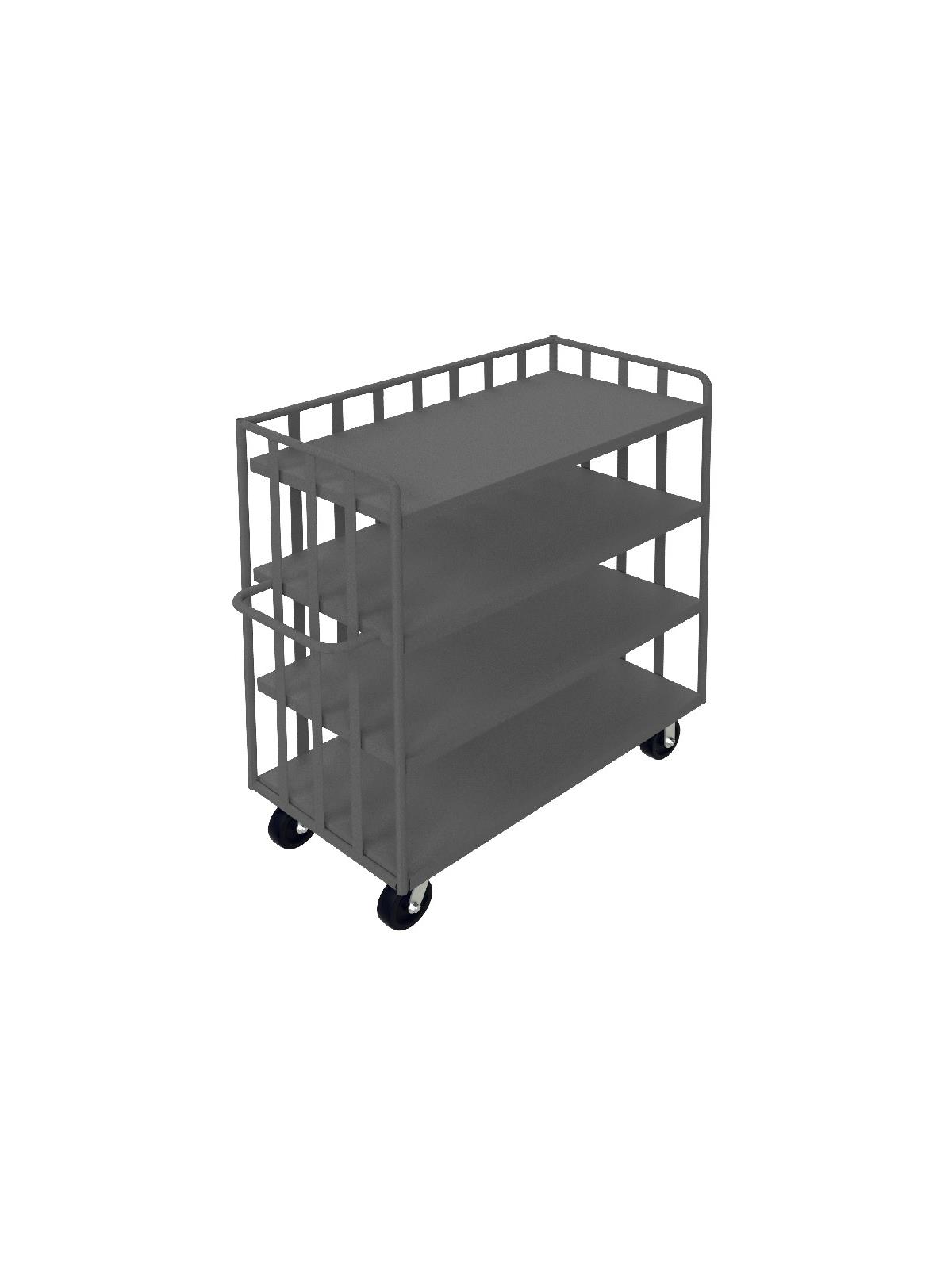Built for heavy 2000 lb. loads. Frame is made from 1" steel tubing. 1/2" rods on sides and back. 14" clearance between shelves. Steel shelves slope 1" from front to rear preventing contents from falling off during transport Shelves are made of 14 ga. steel. Smooth rolling 6" x 2" phenolic bolt-on casters, 2 swivel, 2 rigid. All units are 58"H. Gray powder coat finish. FOB Shipping Point.