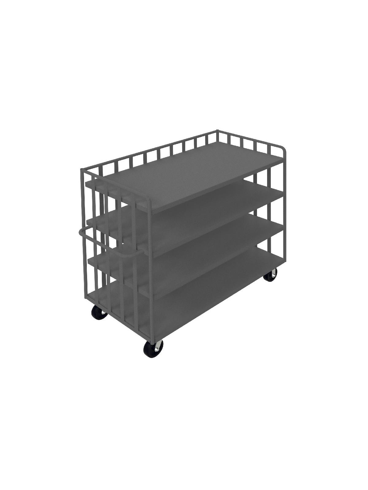 Built for heavy 2000 lb. loads. Frame is made from 1" steel tubing. 1/2" rods on sides and back. 14" clearance between shelves. Steel shelves slope 1" from front to rear preventing contents from falling off during transport Shelves are made of 14 ga. steel. Smooth rolling 6" x 2" phenolic bolt-on casters, 2 swivel, 2 rigid. All units are 58"H. Gray powder coat finish. FOB Shipping Point.