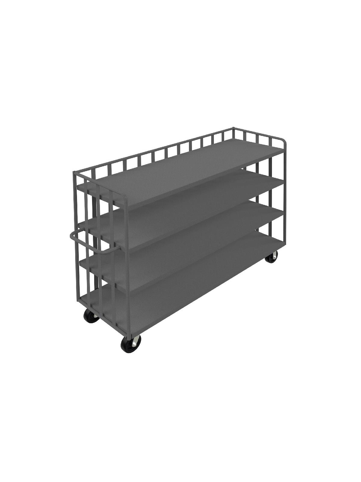 Built for heavy 2000 lb. loads. Frame is made from 1" steel tubing. 1/2" rods on sides and back. 14" clearance between shelves. Steel shelves slope 1" from front to rear preventing contents from falling off during transport Shelves are made of 14 ga. steel. Smooth rolling 6" x 2" phenolic bolt-on casters, 2 swivel, 2 rigid. All units are 58"H. Gray powder coat finish. FOB Shipping Point.
