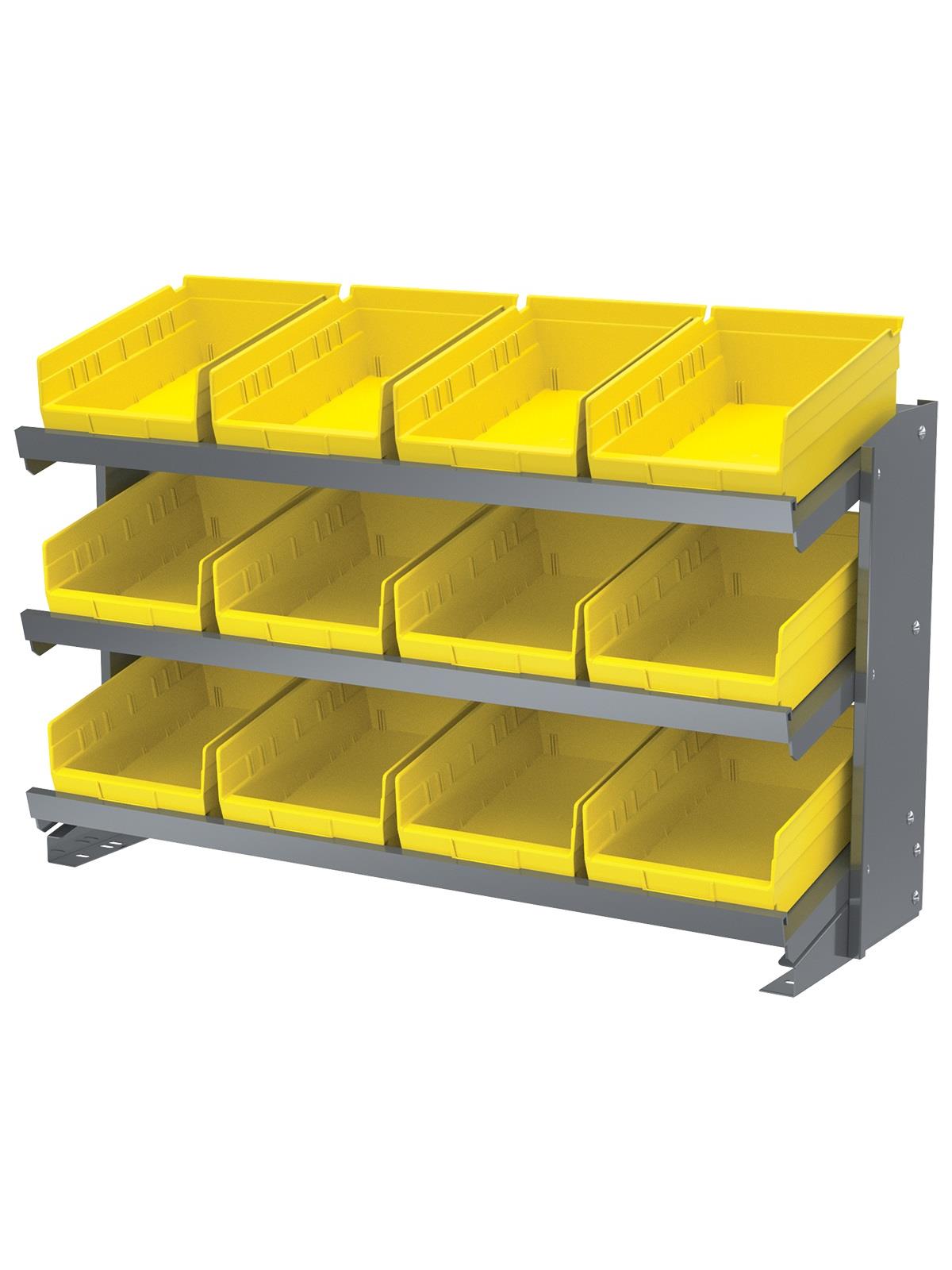 Angled shelves keep small parts in the front of the bins for easy viewing and picking. Convenient heavy-duty storage. Handsome Gray baked-enamel finish. Bins available in Red, Yellow, Blue, Green, or Semi-Clear. FOB Shipping Point.